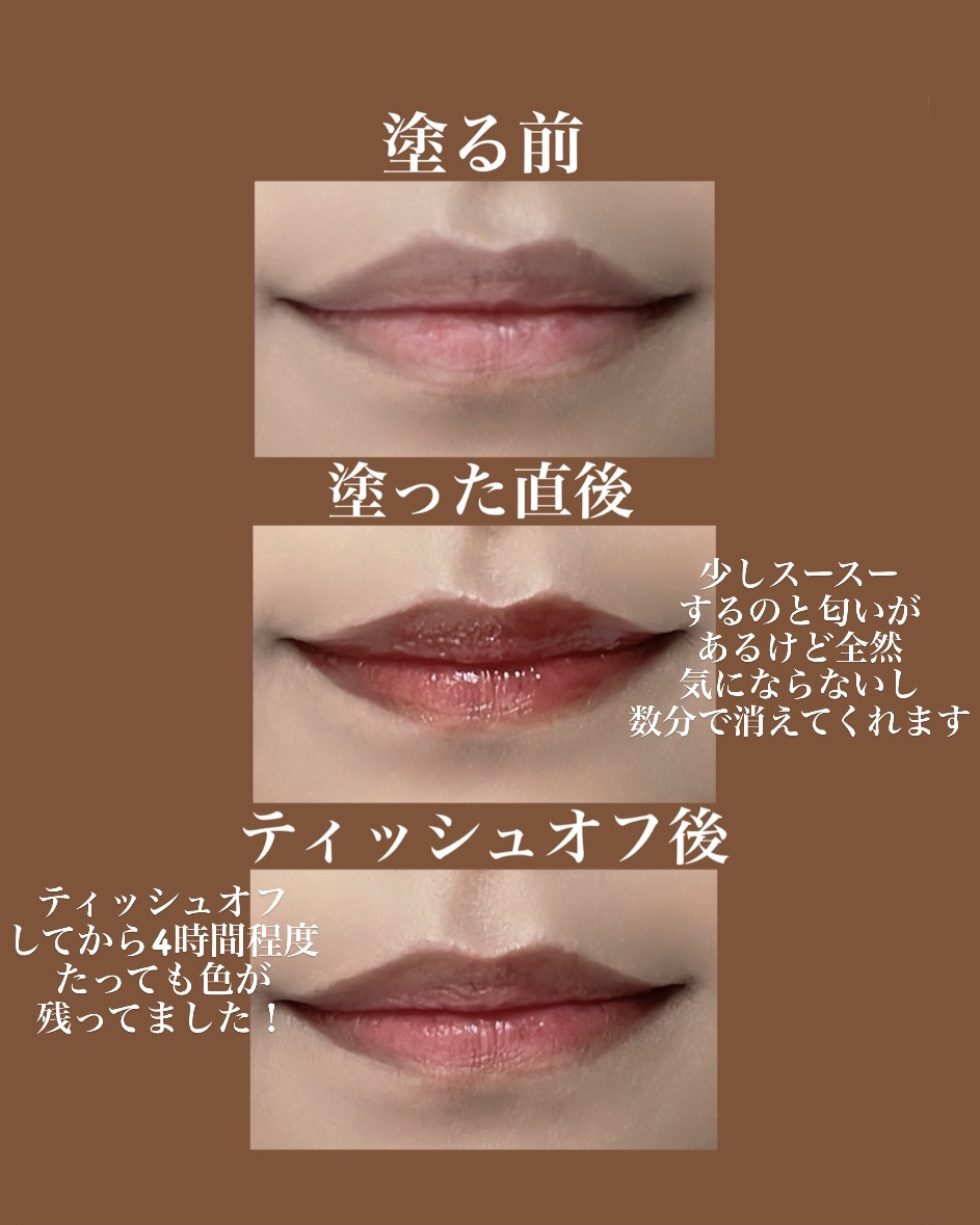 ボタンを押すとリップが出てくるようになっていて、一回押すごとに1ミリくらいしか出てこないため、出し過ぎの心配はいりませんでした。 一度塗ってみて驚き!! 乾き切って血色感もゼロだった唇が、一気に大人っぽくて可愛さもあるうるつやの唇になりました👏 塗った直後はハッカのようなスースーする感じが少しあるのと、少し匂い的なのもありましたが、3、4分後には消えていたので全然気にならないかと! ツヤツヤ系のリップだから色落ち凄そうだな…と思っていましたが、驚くほど残ってます。これすごいです。 テスターで見た他の色も全部かわいかったから、もう全イエベのみなさん買ってください!!ってくらいおすすめです!