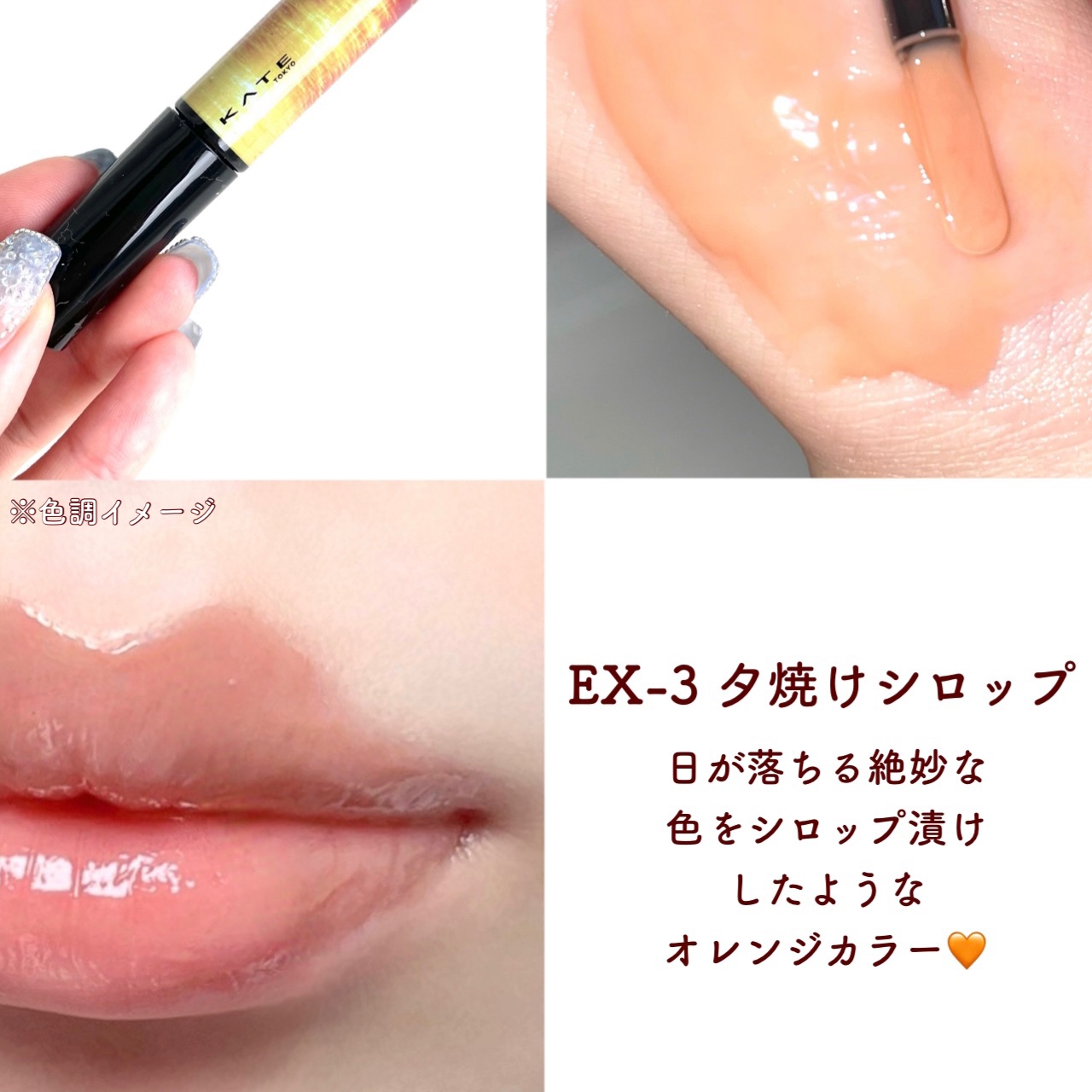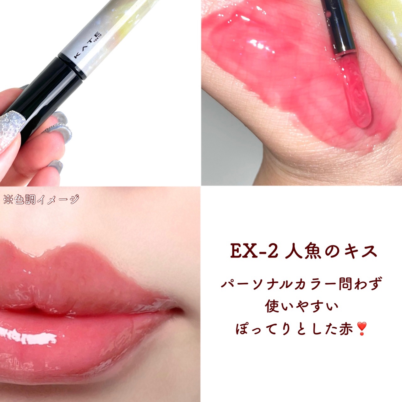 \KATEミルキーウォータリーリップ/EX-1くらげくらぶクリアブルー系EX-2 人魚のキス クリアレッド系EX-3 夕焼けシロップ クリアブラウン系これだけで使うというよりはニュアンスチェンジのような感じで上から重ねるとオシャレです#はじけ...