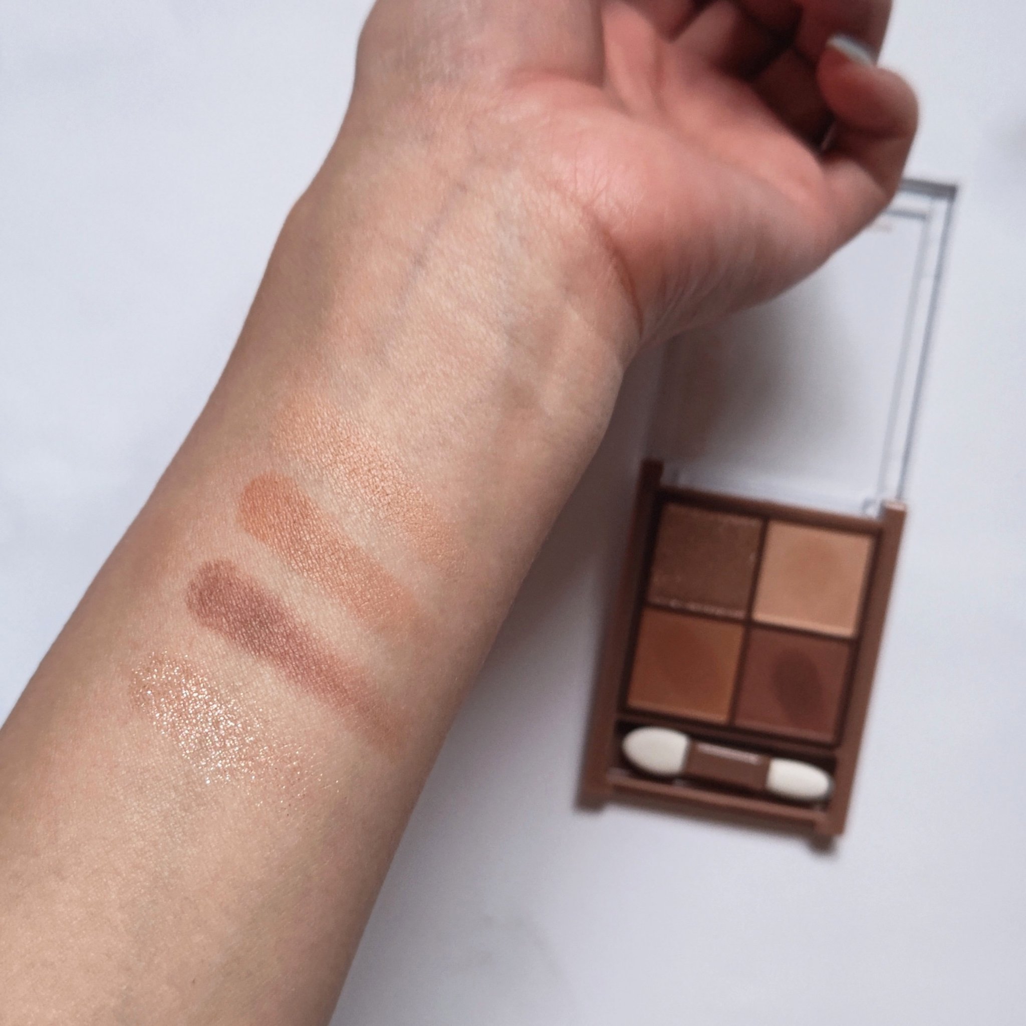 - 透け感マット×濃厚ブラウンの4色アイシャドウ。 しっかり目元を引き締めるビターなブラウンカラー。 透け感のあるブラウンを重ねて、自然な陰影のある目元へ。 ふんわり柔らかなパウダーなので、スルスル伸びてまぶたにピタッと密着。 保湿成分(スクワラン、ホホバ種子油)配合。