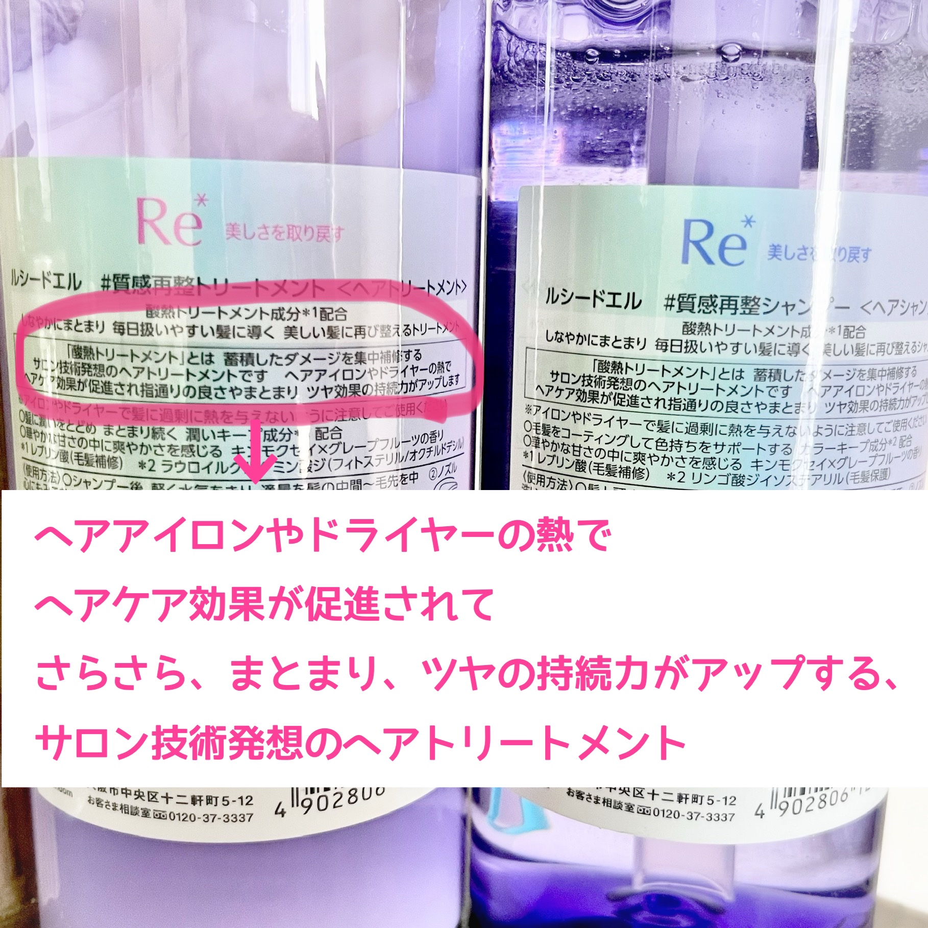 - <シャンプー> もちもちの泡で摩擦ダメージを抑え、きしみ・引っ掛かりのない操作性で傷んだ髪をなめらかに洗い上げる酸熱ケアシャンプー。ドライヤーやヘアアイロンの熱を活かしてうねり・くせ・広がり等のハイダメージ毛をまとまるツヤ髪に導きます。 〇キンモクセイ×グレープフルーツの香り 〇酸熱トリートメント成分*1配合 〇ヒートリペア成分2*配合 〇カラーキープ成分*3配合 〇アミノ酸系洗浄成分配合 〇ラウレス硫酸塩フリー 〇パラベンフリー <トリートメント> 傷んだ髪に密着し髪の内・外部を補修。ダメージでパサつく髪にうるおいのある保湿感が持続する酸熱ケアトリートメント。ドライヤーやヘアアイロンの熱を活かして、うねり・くせ・広がり等のハイダメージ毛をまとまるツヤ髪に導きます。 〇キンモクセイ×グレープフルーツの香り 〇酸熱トリートメント成分*1配合 〇ヒートリペア成分*2配合 〇潤いキープ成分*4配合 〇パラベンフリー *1レブリン酸(毛髪補修) *2メドウフォーム-δ-ラクトン *3リンゴ酸ジイソステアリル(毛髪保護) *4ラウロイルグルタミン酸ジ(フィトステリル/オクチルドデシル)