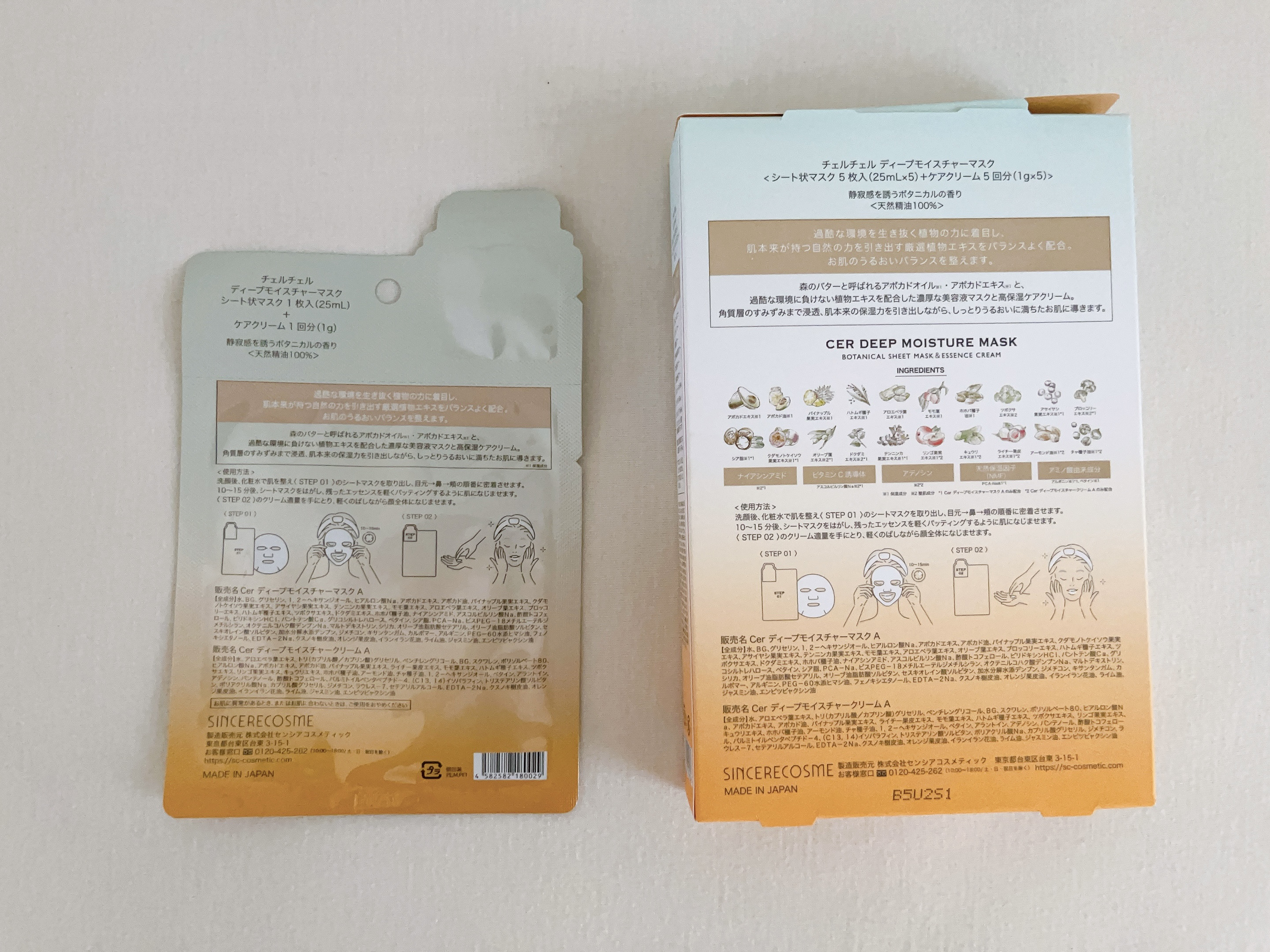 - Cer ディープモイスチャーマスク A 水、BG、グリセリン、1,2-ヘキサンジオール、ヒアルロン酸Na、アボカドエキス、アボカド油、パイナップル果実エキス、クダモノトケイソウ果実エキス、アサイヤシ果実エキス、テンニンカ果実エキス、モモ葉エキス、アロエベラ葉エキス、オリーブ葉エキス、ブロッコリーエキス、ハトムギ種子エキス、ツボクサエキス、ドクダミエキス、ホホバ種子油、ナイアシンアミド、アスコルビルリン酸Na、酢酸トコフェロール、ピリドキシンHCl、パントテン酸Ca、グリコシルトレハロース、ベタイン、シア脂、PCA-Na、ビスPEG-18メチルエーテルジメチルシラン、オクテニルコハク酸デンプンNa、マルトデキストリン、シリカ、オリーブ油脂肪酸セテアリル、オリーブ油脂肪酸ソルビタン、セスキオレイン酸ソルビタン、加水分解水添デンプン、ジメチコン、キサンタンガム、カルボマー、アルギニン、PEG-60水添ヒマシ油、フェノキシエタノール、EDTA-2Na、クスノキ樹皮油、オレンジ果皮油、イランイラン花油、ライム油、ジャスミン油、エンピツビャクシン油 Cer ディープモイスチャークリーム A 水、アロエベラ葉エキス、トリ(カプリル酸/カプリン酸)グリセリル、ペンチレングリコール、BG、スクワレン、ポリソルベート80、ヒアルロン酸Na、アボカドエキス、アボカド油、パイナップル果実エキス、ライチー果皮エキス、モモ葉エキス、ハトムギ種子エキス、ツボクサエキス、リンゴ果実エキス、キュウリエキス、ホホバ種子油、アーモンド油、チャ種子油、1,2-ヘキサンジオール、ベタイン、アラントイン、アデノシン、パンテノール、酢酸トコフェロール、パルミトイルペンタペプチド-4、(C13,14)イソパラフィン、トリステアリン酸ソルビタン、ポリアクリル酸Na、カプリル酸グリセリル、ジメチコン、ラウレス-7、セテアリルアルコール、EDTA-2Na、クスノキ樹皮油、オレンジ果皮油、イランイラン花油、ライム油、ジャスミン油、エンピツビャクシン油