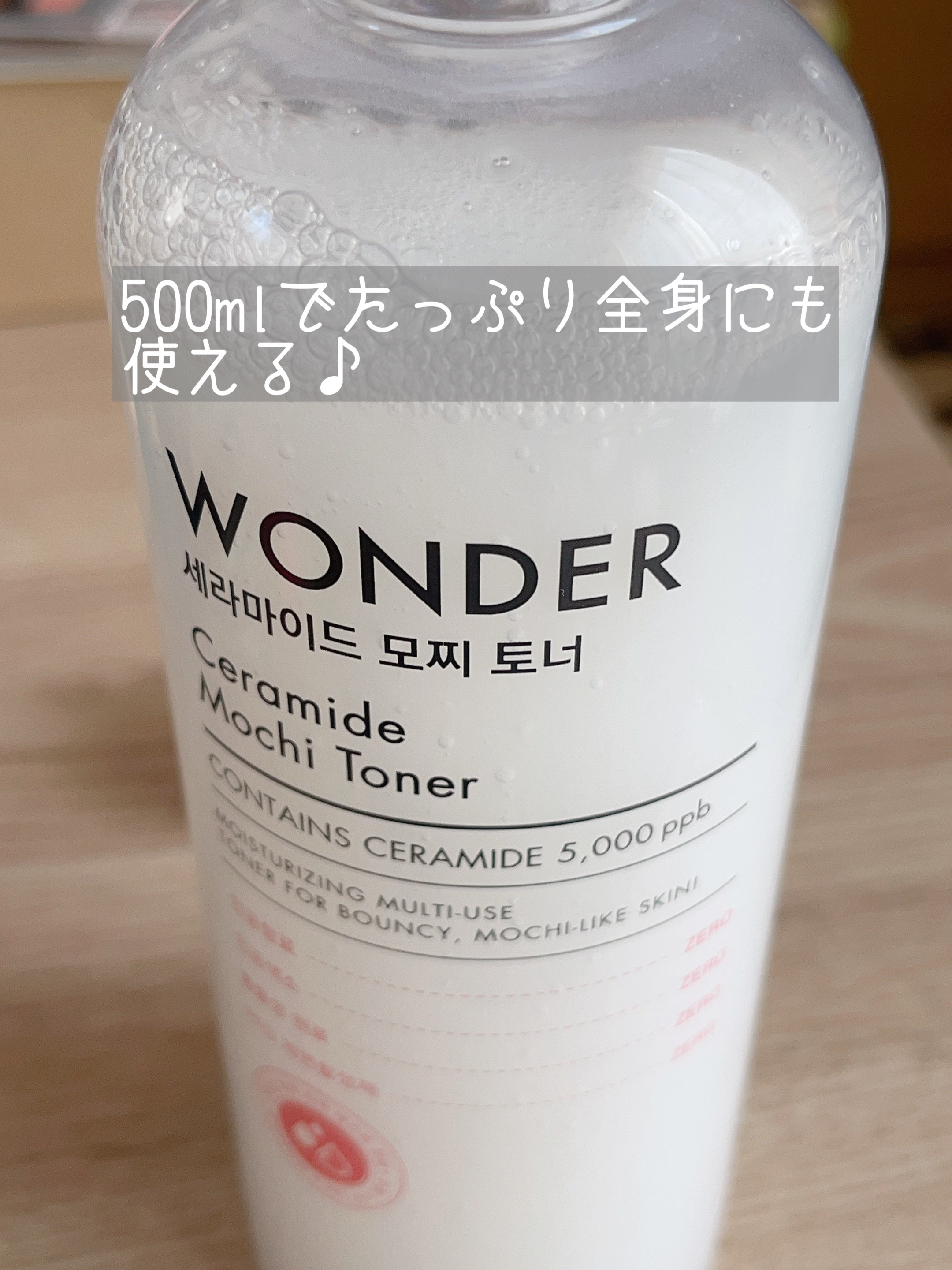 トニーモリーワンダーCモチトナー。元祖国民トナー。セラミド、ヒアルロン酸、パンテノール、ツボクサエキス配合。500mlの大容量。私はお風呂の後にボディに使っています。身体を拭いたらバスルームに戻ってトナーを身体にかけて、なじませます。後でバス...