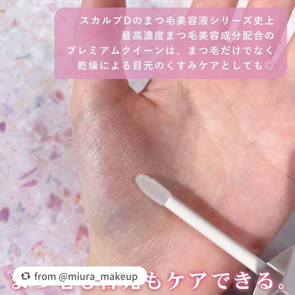 - スカルプDまつ毛美容液シリーズ史上まつ毛美容成分最高濃度※1♪ 「ラッシュDカプセル」3倍※2に加え、独自開発の「プレミアムクイーンカプセル」※3 を配合。 さらに「目元ケアもできるまつ毛美容液」として目元のお肌にうるおいを与えて、乾燥による小じわを目立たなくします※4。 使いやすさ・やさしさにこだわった、ふわふわカールチップ採用で根元からも塗りやすく、敏感な目元にやさしい使い心地。 シリコン、オイル、アルコール(エタノール)、防腐剤(パラベン)、香料、合成着色料、界面活性剤、プロスタグランジン類似物質の8つの成分不使用のピュアフリー設計を実現。まつ毛エクステ、まつ毛パーマにも使え、1日1回のケアでもOKとなっています。 ※1.スカルプDまつ毛美容液シリーズ内最高濃度のこと※2.保湿成分、白金、ビオチノイルトリペプチド-1、パンテノール、グリセリン、ピロリジニルジアミノピリミジンオキシド、シスチン、グルタミン酸、当社SDBピュアフリーアイラッシュセラムSSC2と比較※3.保湿成分、白金、アセチルテトラペプチド-3、アカツメクサ花エキス、ゴボウ根エキス、オオミテングヤシ果実エキス※4.効能評価試験済み