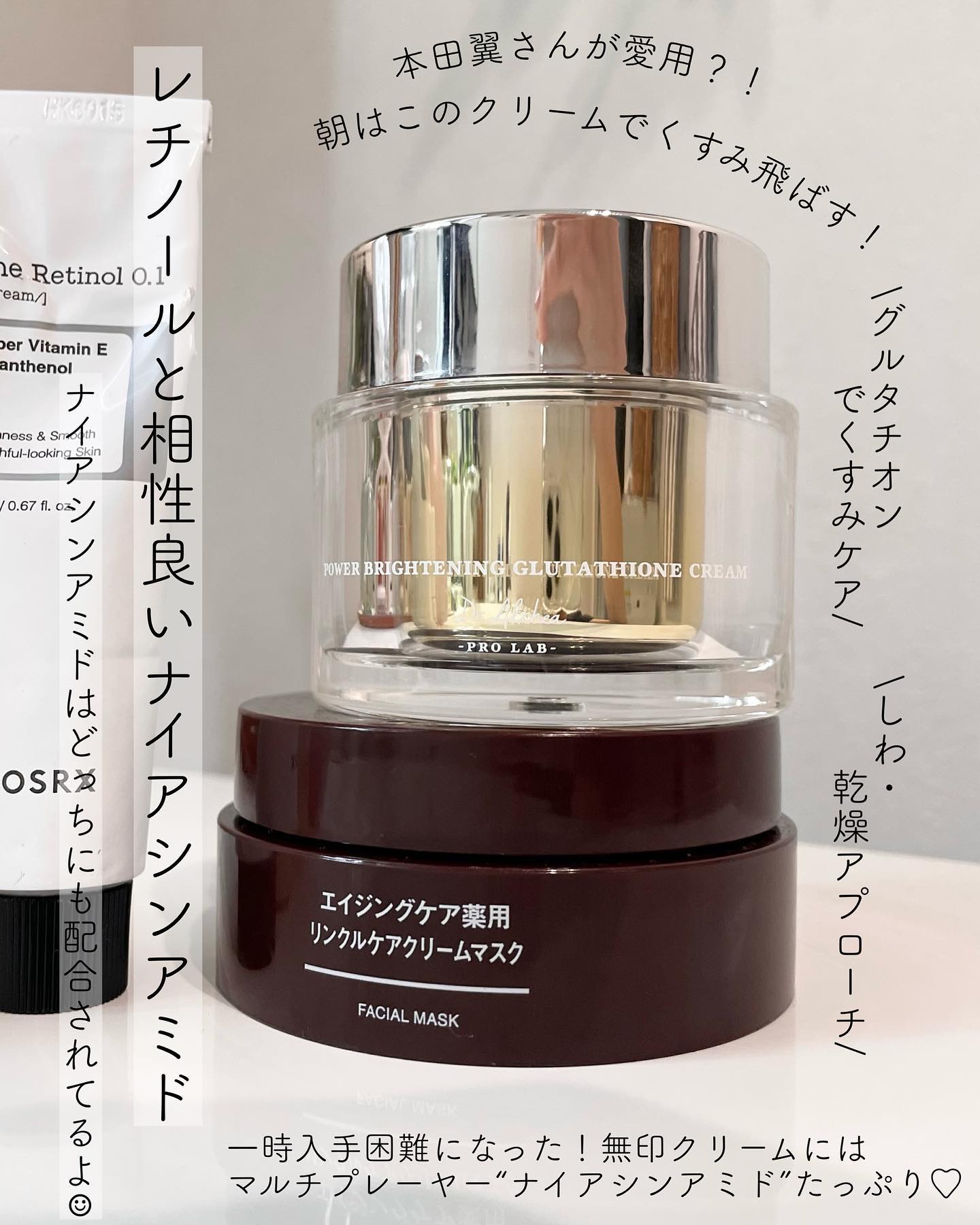 前回紹介した朝晩首スキンケアラインの方が改善を実感できました🤣! 紫外線強い時期なのでレチノールの濃度を1%から0.1%に下げてる レチノール慣れしてない人は0.1%から徐々に慣らすのがおすすめ! 日焼け止め塗ってはいるんだけど首のくすみは夏の紫外線にやられてる 毎日の日焼け止めは以前愛用してたオルビスに戻します。 グルタチオンクリームが生クリームテクスチャでスキンケアしつつ自然にくすみカバーしてくれるので好き💕