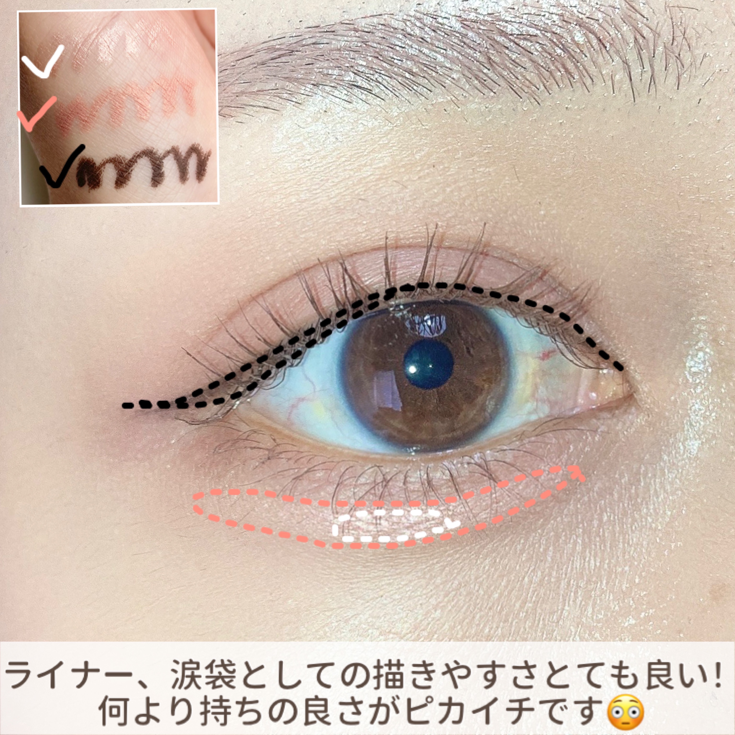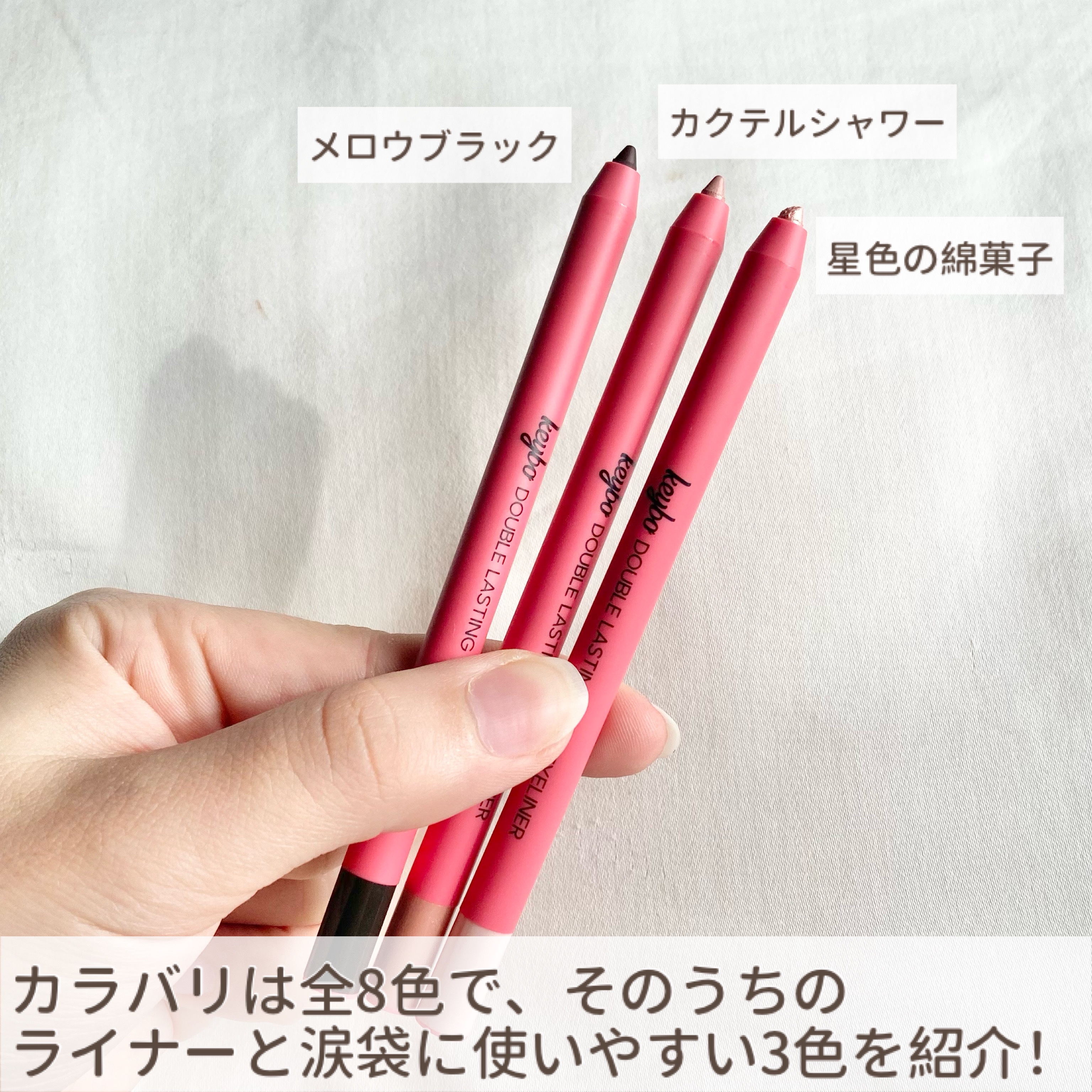 油分、水分に強いマルチプルーフで、1日くずれないアイラインはもちろん、シャドウまで一気に演出できるアイライナーです 柔らかい芯でスルスルとなめらかな描き心地で、発色もきれい この3本で、アイライナーからアイシャドウまで完成するからアイメイクが手軽にできるのが◎