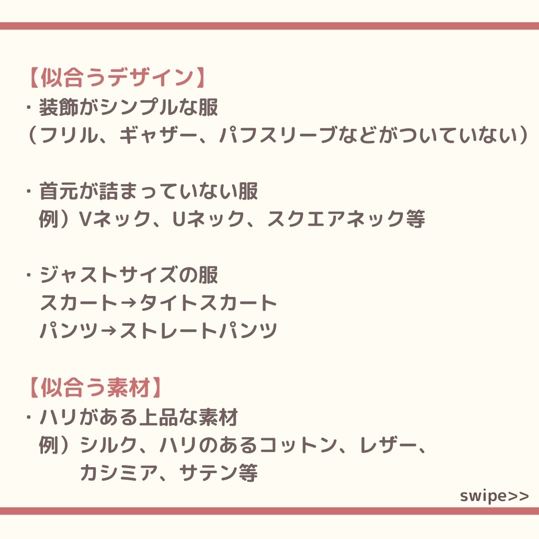 ・重心に偏りがない・フレーム感のある体型・筋肉も脂肪もつきにくい・首の筋がはっきりで出ている・鎖骨が太く目立つ・肩幅が広め・バスト位置は平均的・ウエスト位置が目立たない・ヒップラインがなだらか・膝の皿が大きい・手が大きめ・関節が大きく目立つ ・手の甲の筋がはっきり出ている・体に対してサイズが大きめ・関節が大きく目立つ・手首の骨もかなり目立つ・爪も大きめ ・オーバーサイズめな服(フレーム感が緩和されるため)・個性的な服例)アシンメトリー・甘すぎない服(レース、フリル、シフォンなどの素材でないもの) ・体のラインを拾わない素材例)デニム、コットン、ざっくりニット、ツイード、コーデュロイ等