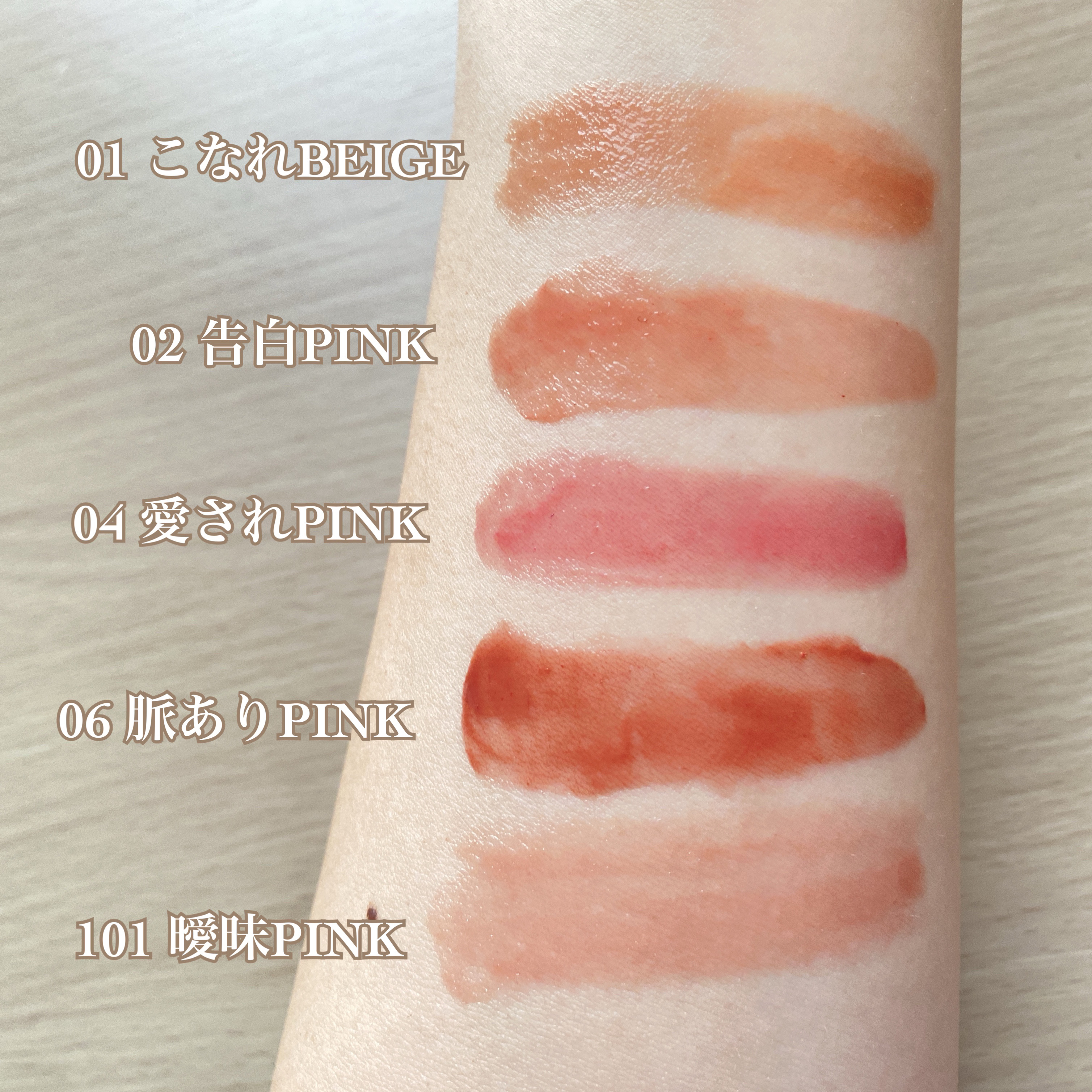 - <01 こなれBEIGE【新】> リンゴ酸ジイソステアリル、ダイマージリノール酸ダイマージリノレイルビス(ベヘニル/イソステアリル/フィトステリル)、(アジピン酸/カプリン酸/カプリル酸/ヘプタン酸)ペンタエリスリチル、(VP/ヘキサデセン)コポリマー、ビスジグリセリルポリアシルアジペート-2、パラフィン、オクチルドデカノール、乳酸メンチル、マイクロクリスタリンワックス、1,2-ヘキサンジオール、イソステアリン酸ソルビタン、酸化チタン、酸化鉄、合成ワックス、セチルPEG/PPG-10/1ジメチコン、ジステアルジモニウムヘクトライト、酢酸トコフェロール、香料、炭酸プロピレン、赤202、リモネン、トリエトキシカプリリルシラン、リナロール、シトラール、ホホバ種子油、ヒアルロン酸Na、アルガニアスピノサ核油 <02 告白PINK【新】> リンゴ酸ジイソステアリル、ダイマージリノール酸ダイマージリノレイルビス(ベヘニル/イソステアリル/フィトステリル)、(アジピン酸/カプリン酸/カプリル酸/ヘプタン酸)ペンタエリスリチル、ビスジグリセリルポリアシルアジペート-2、(VP/ヘキサデセン)コポリマー、パラフィン、オクチルドデカノール、乳酸メンチル、マイクロクリスタリンワックス、1,2-ヘキサンジオール、イソステアリン酸ソルビタン、酸化チタン、合成ワックス、セチルPEG/PPG-10/1ジメチコン、ジステアルジモニウムヘクトライト、赤202、酢酸トコフェロール、香料、⻩5、炭酸プロピレン、⻘1、リモネン、リナロール、シトラール、アルガニアスピノサ核油、ホホバ種子油、ヒアルロン酸Na <03 きまぐれBROWN【新】> リンゴ酸ジイソステアリル、ダイマージリノール酸ダイマージリノレイルビス(ベヘニル/イソステアリル/フィトステリル)、(アジピン酸/カプリン酸/カプリル酸/ヘプタン酸)ペンタエリスリチル、(VP/ヘキサデセン)コポリマー、ビスジグリセリルポリアシルアジペート-2、パラフィン、オクチルドデカノール、乳酸メンチル、マイクロクリスタリンワックス、1,2-ヘキサンジオール、イソステアリン酸ソルビタン、酸化鉄、酸化チタン、合成ワックス、セチルPEG/PPG-10/1ジメチコン、ジステアルジモニウムヘクトライト、酢酸トコフェロール、香料、炭酸プロピレン、赤104(1)、リモネン、リナロール、シトラール、ホホバ種子油、ヒアルロン酸Na、アルガニアスピノサ核油 <04 愛されPINK【新】> リンゴ酸ジイソステアリル、ダイマージリノール酸ダイマージリノレイルビス(ベヘニル/イソステアリル/フィトステリル)、(アジピン酸/カプリン酸/カプリル酸/ヘプタン酸)ペンタエリスリチル、(VP/ヘキサデセン)コポリマー、ビスジグリセリルポリアシルアジペート-2、パラフィン、オクチルドデカノール、乳酸メンチル、マイクロクリスタリンワックス、1,2-ヘキサンジオール、イソステアリン酸ソルビタン、酸化チタン、合成ワックス、セチルPEG/PPG-10/1ジメチコン、ジステアルジモニウムヘクトライト、酸化鉄、酢酸トコフェロール、香料、赤202、黄4、炭酸プロピレン、リモネン、リナロール、シトラール、アルガニアスピノサ核油、ホホバ種子油、ヒアルロン酸Na <05 無敵テラコッタ【新】> リンゴ酸ジイソステアリル、ダイマージリノール酸ダイマージリノレイルビス(ベヘニル/イソステアリル/フィトステリル)、(アジピン酸/カプリン酸/カプリル酸/ヘプタン酸)ペンタエリスリチル、(VP/ヘキサデセン)コポリマー、ビスジグリセリルポリアシルアジペート-2、パラフィン、オクチルドデカノール、乳酸メンチル、マイクロクリスタリンワックス、酸化鉄、1,2-ヘキサンジオール、イソステアリン酸ソルビタン、セチルPEG/PPG-10/1ジメチコン、合成ワックス、酸化チタン、ジステアルジモニウムヘクトライト、酢酸トコフェロール、香料、炭酸プロピレン、リモネン、トリエトキシカプリリルシラン、リナロール、シトラール、ホホバ種子油、ヒアルロン酸Na、アルガニアスピノサ核油 <06 脈ありPINK【新】> リンゴ酸ジイソステアリル、ダイマージリノール酸ダイマージリノレイルビス(ベヘニル/イソステアリル/フィトステリル)、(アジピン酸/カプリン酸/カプリル酸/ヘプタン酸)ペンタエリスリチル、(VP/ヘキサデセン)コポリマー、ビスジグリセリルポリアシルアジペート-2、パラフィン、オクチルドデカノール、乳酸メンチル、マイクロクリスタリンワックス、1,2-ヘキサンジオール、イソステアリン酸ソルビタン、酸化チタン、酸化鉄、合成ワックス、セチルPEG/PPG-10/1ジメチコン、ジステアルジモニウムヘクトライト、酢酸トコフェロール、香料、炭酸プロピレン、赤202、リモネン、リナロール、シトラール、ホホバ種子油、ヒアルロン酸Na、アルガニアスピノサ核油 <07 惚れさせCASSIS【新】> リンゴ酸ジイソステアリル、ダイマージリノール酸ダイマージリノレイルビス(ベヘニル/イソステアリル/フィトステリル)、(アジピン酸/カプリン酸/カプリル酸/ヘプタン酸)ペンタエリスリチル、ビスジグリセリルポリアシルアジペート-2、(VP/ヘキサデ