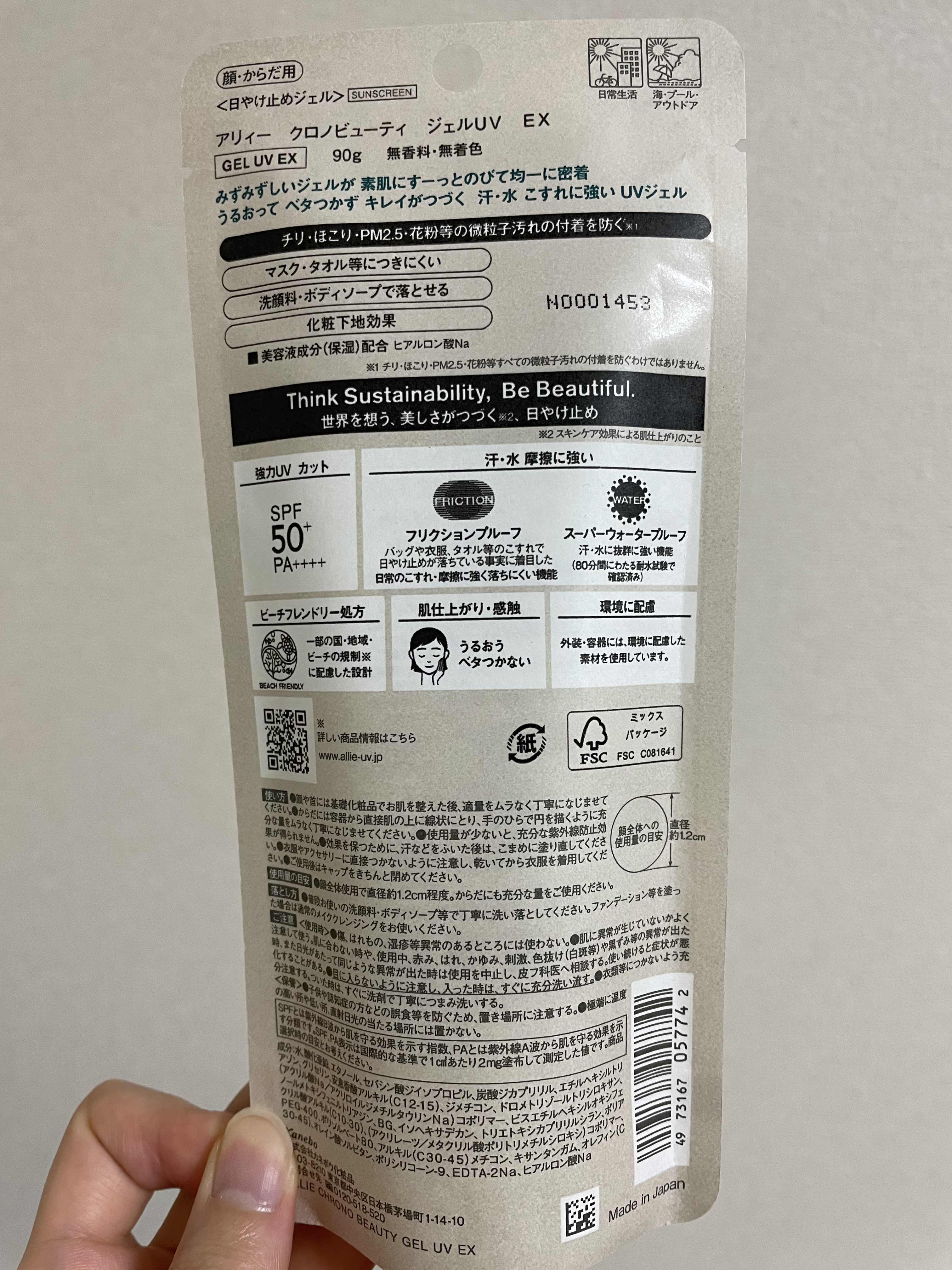 - 世界を想う 美しさつづく*1 日やけ止め おでかけには、落ちにくく、気持ちいい感触がつづく日やけ止めを。 一部の国・地域・ビーチの規制に配慮した設計のビーチフレンドリー処方。 汗・水・こすれにも強く、ベタつかずうるおう仕上がりが持続するジェル UV ●一部の国・地域・ビーチの規制に配慮した設計の「ビーチフレンドリー処方」 ●SPF50+・PA++++ ●汗・水 こすれに強く落ちにくい フリクションプルーフ・スーパーウォータープルーフ ●ベタつきにくい感触がつづく ●うるおい感のある肌仕上がりがつづく ●環境に配慮した素材を使用したパッケージ採用 ●美容液成分(保湿)ヒアルロン酸Na配合 ●顔・からだ用 ●洗顔料・ボディーソープで落とせる ●マスク・タオル等につきにくい ●化粧下地効果 ●無香料・無着色 ●チリ・ほこり・PM2.5・花粉等の微粒子汚れの付着を防ぐ*2 *1 スキンケア効果またはメイクアップ効果による肌仕上がりのこと *2 チリ・ほこり・PM2.5・花粉等すべての微粒子汚れの付着を防ぐわけではありません <限定セットA:セット内容> ・アリィー クロノビューティ ジェルUV EX 90g ・アリィー クロノビューティ ラスティングプライマーUV 5g ※セット商品の成分につきましては各商品ページでご確認ください。