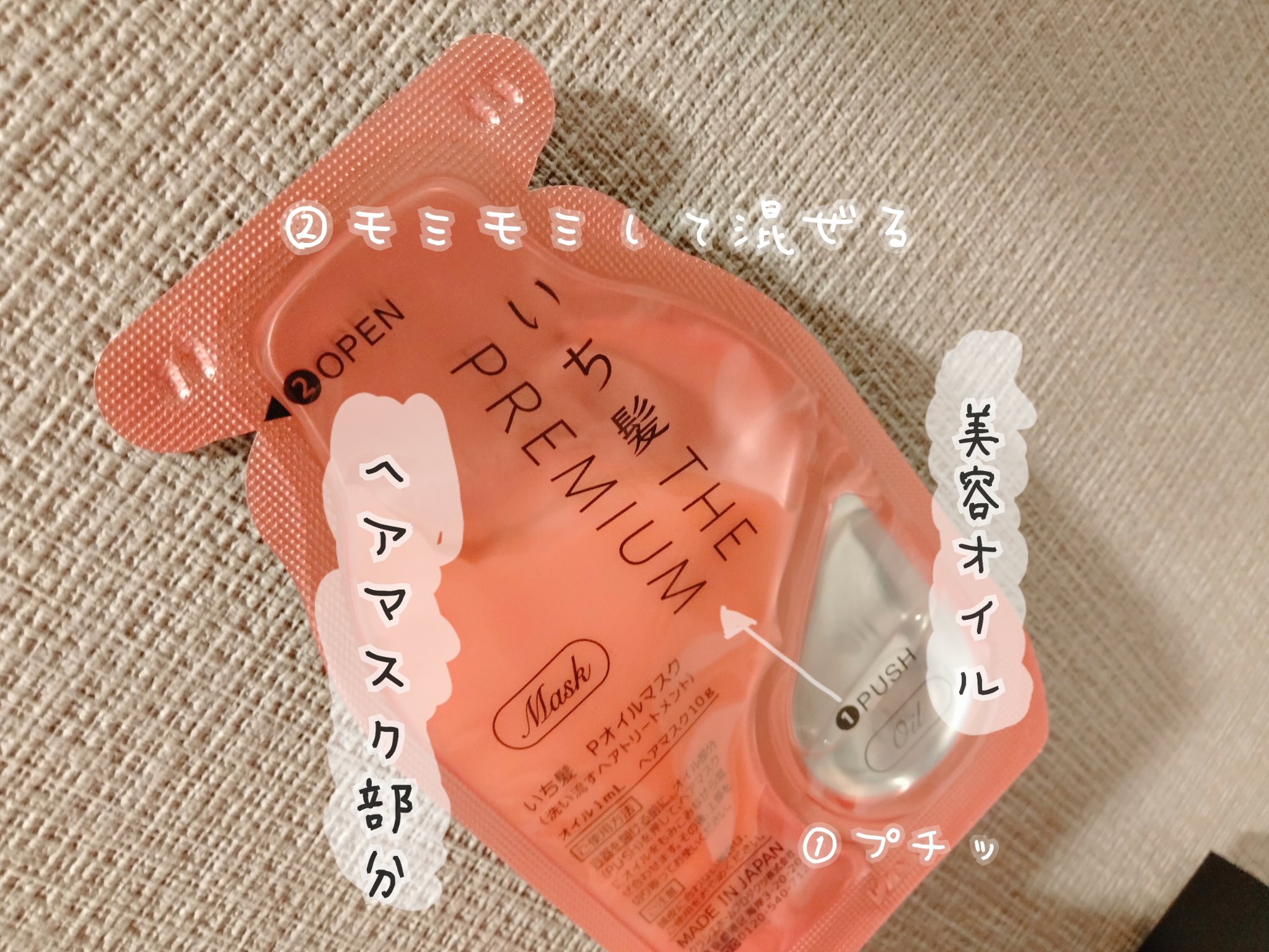 - ●「日本の髪を本質から考える。*1」ヘアケアブランド ●日本の髪研究の成果。アイロン等の熱ダメージによる乾燥髪のためのプレミアムダメージケアシリーズ ●今まで体験したことのない*2美容オイルを注入、混ぜるヘアマスク(洗い流すトリートメント) ●手触り、感動的。集中補修×オイルコートで、ヘアマスクとも、ヘアオイルとも違う体験で、つるんとした髪へ。 ●髪内部と外側をWでケアする「プレミアムWリペアシステム」 ・集中補修成分「高濃度*3米ぬか発酵導入美容液*4」配合のヘアマスクで、髪の内部を補修 ・指通りUP成分「和草・導入美容オイル*5」とドライヤーの熱を味方にキューティクルを密着する「ヒートリペアコート成分*6」で、髪の外側をコートして指通りをアップ ●つややかな八重桜の香り(天然桜エッセンス配合香料) ●サルフェートフリー(硫酸系界面活性剤不使用) ●合成着色料フリー *1:日本の風土や気候などの環境に合わせたヘアケア方法を研究しています。 *2:いち髪ブランド内 *3:いち髪 THE PREMIUM エクストラダメージケアトリートメント(シャイニーモイスト)比 *4:米ぬか発酵液、ハス種子発酵液、酒粕エキス、セバシン酸ジエチル、グリセリン *5:米胚芽油、オリザノール、セバシン酸ジエチル *6: γ-ドコサラクトン