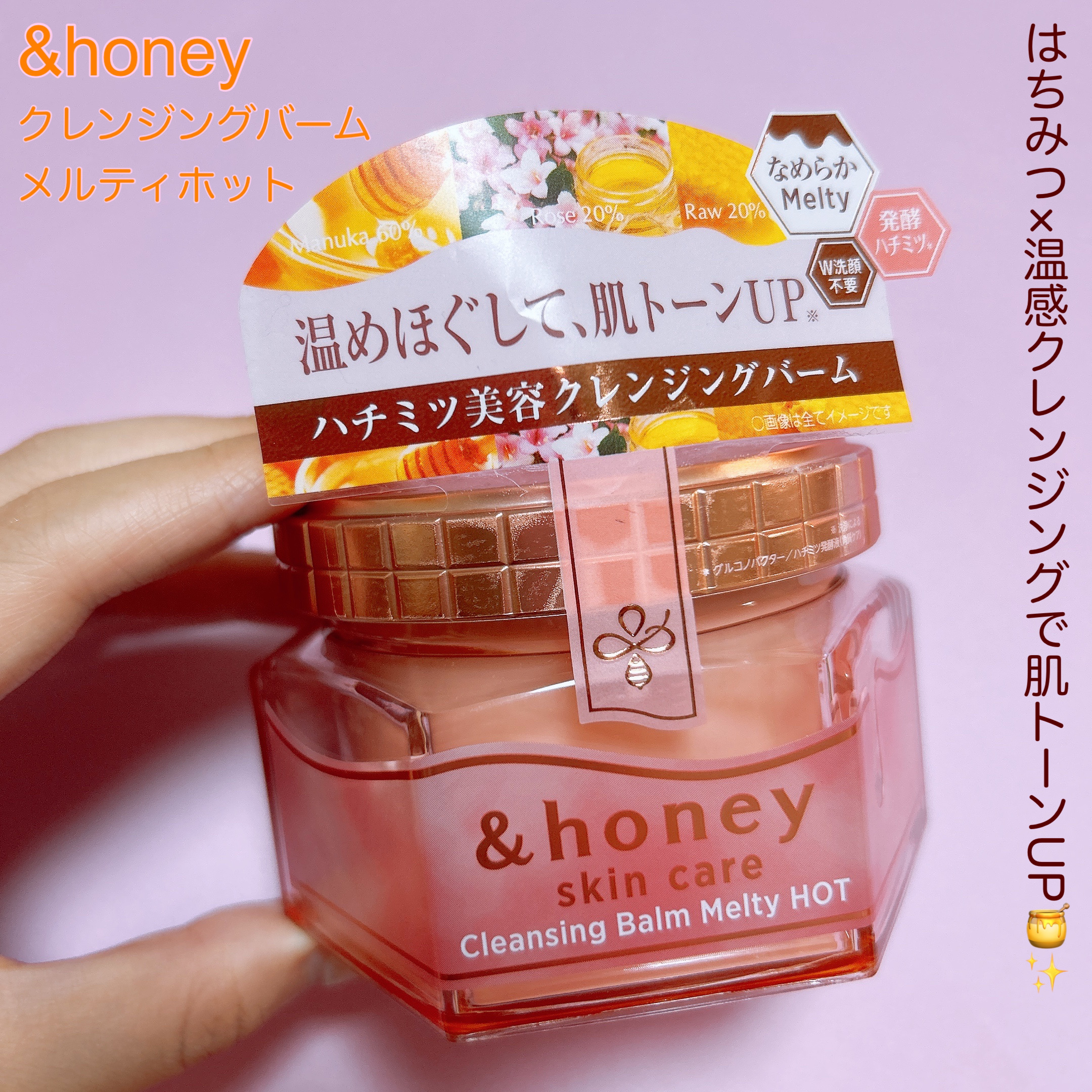 - &honey クレンジングバームから じんわりあったか温感バーム【メルティホット】シリーズ とろけるあったかバームがじんわりお肌をやわらげることで、 メイクや古い角質を浮かし、なめらかなお肌へ導きます。 製品の90%以上を保湿・整肌成分で構成しW酵素成分を配合することで、くすみ※をケアして肌トーンUP 香りは甘く華やかなシャワーローズハニーの香り。 ※古い角質や汚れによる