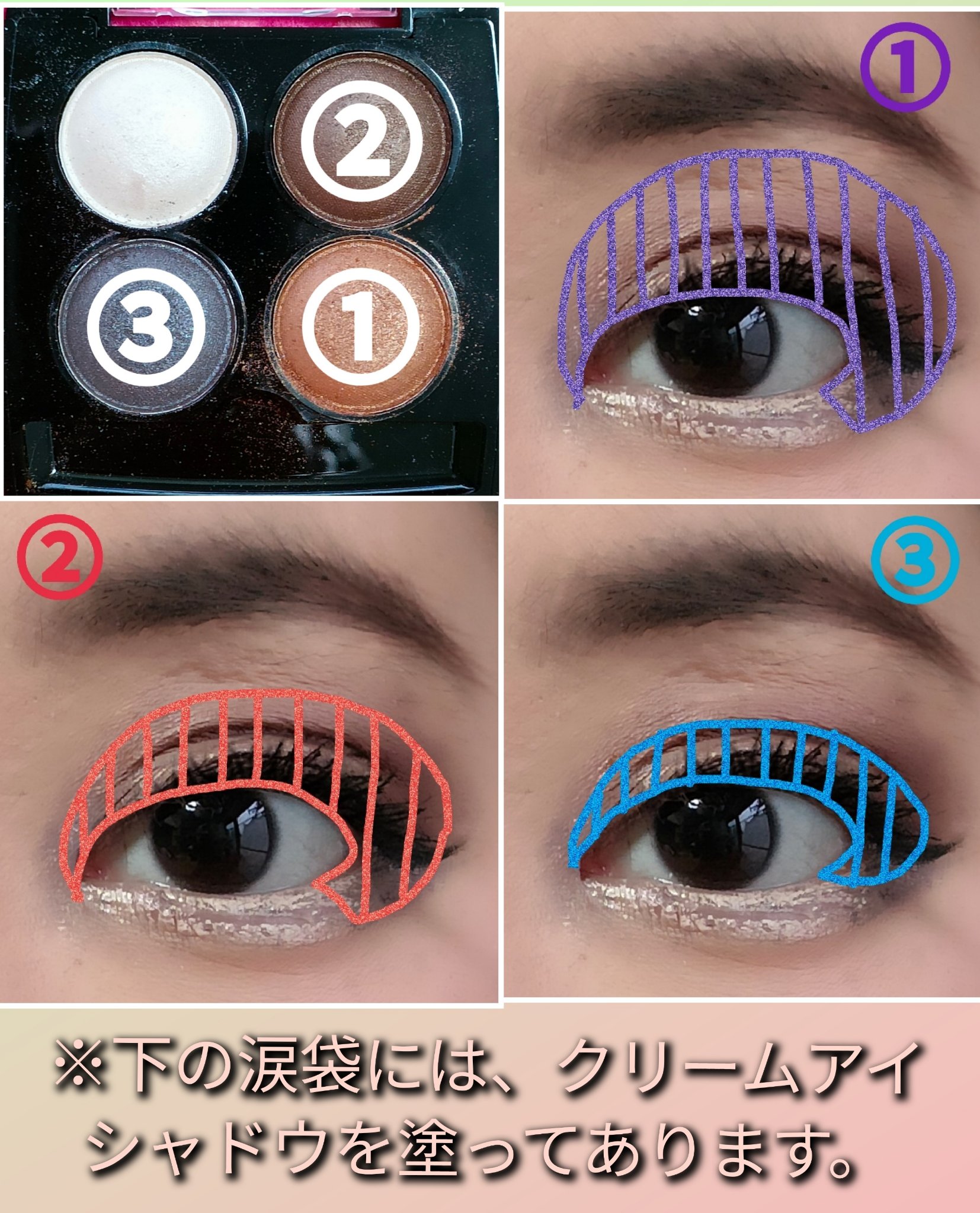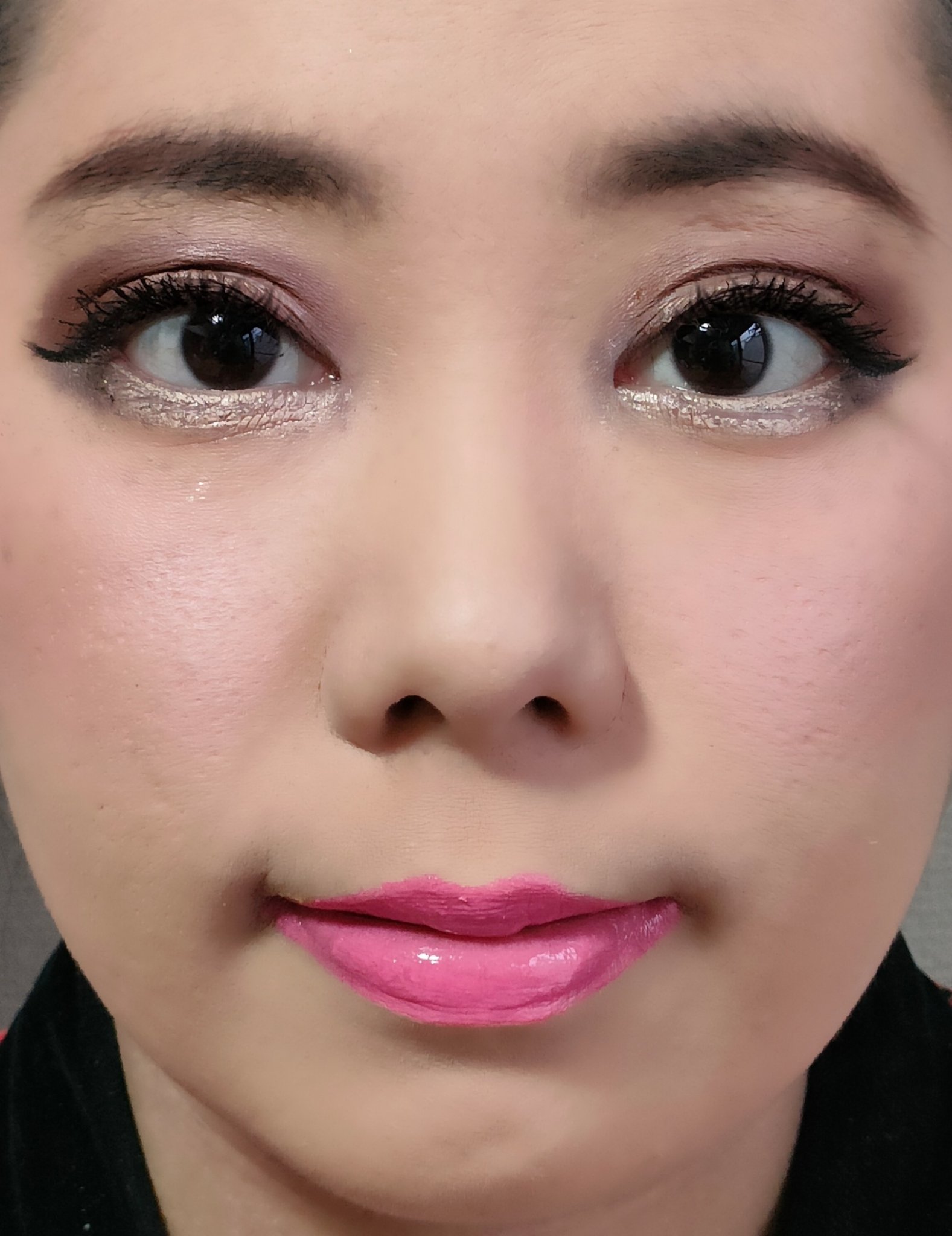 アイシャドウパレットは、URGLAM UR GLAMBLOOMING EYE COLOR PALETTE 02を、使用しました。 マスカラは、MAYBELLINE NEW YORK コロッサルボリュームエクスプレスを、まつ毛全体にまんべんなく塗ります。 リップは、wet 'n' wild MegaLast Lip Colorを、唇全体にまんべんなく塗ります。