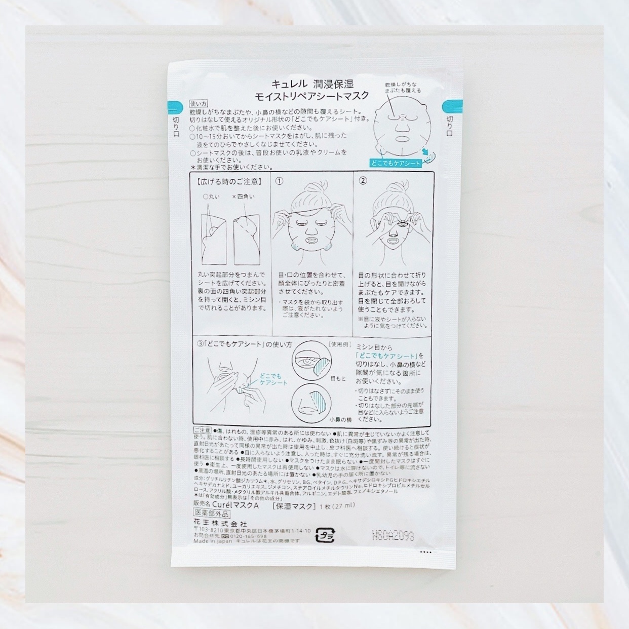 肌荒れを防ぐ消炎剤配合(有効成分) ✔️ セラミドの働きを補い、濃密な潤いをすみずみまで補給してくれるそう ✔️肌あたりやわらかなシートマスク 厚めのシートで肌あたりも良く、肌にピタッと密着してくれます。お肌が敏感な時でも優しい使い心地と、キメが整いもちっとする使用感がいいです。 マスクの下の部分は、切り離して小鼻等の隙間に貼れます。マスクのサイズによっては隙間ができるものもあるので、これも嬉しい。