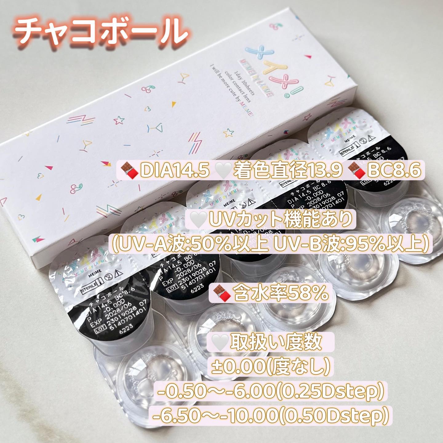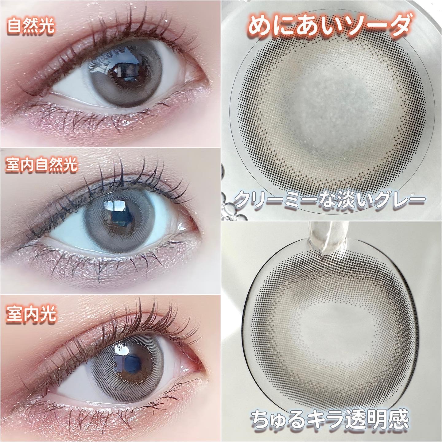 さくさくコロモンはベージュだけど色も明るすぎない自然な感じだから浮かなかった🙆🏻♀️💗 大きすぎす小さすぎなくて盛れる おしゃれカワイイ系カラコン めにあいソーダは白味系グレーの高発色じゃなくて発色いい方な色素薄い系 遠くからみたらほんのり発色してるくらい 私の場合はかなり瞳はっきりする 眼力が強い人がつけると怖いか、 カッコよくなりすぎるかも?! カワイイ系の服よりストリート系、 y2kファッション、ギャル系統とかに合いそう🤔 チャコボール この中でサイズが1番大きいけど レンズのデザインが浮くことないカラーとぼかしフチで ナチュラルだけど盛れる瞳になる🫰🏻💗 韓国とかの水光レンズとかにくらべると 立体感とちゅる感は控えめなので ちゅるちゅるしすぎるのが苦手な方にも良さそう