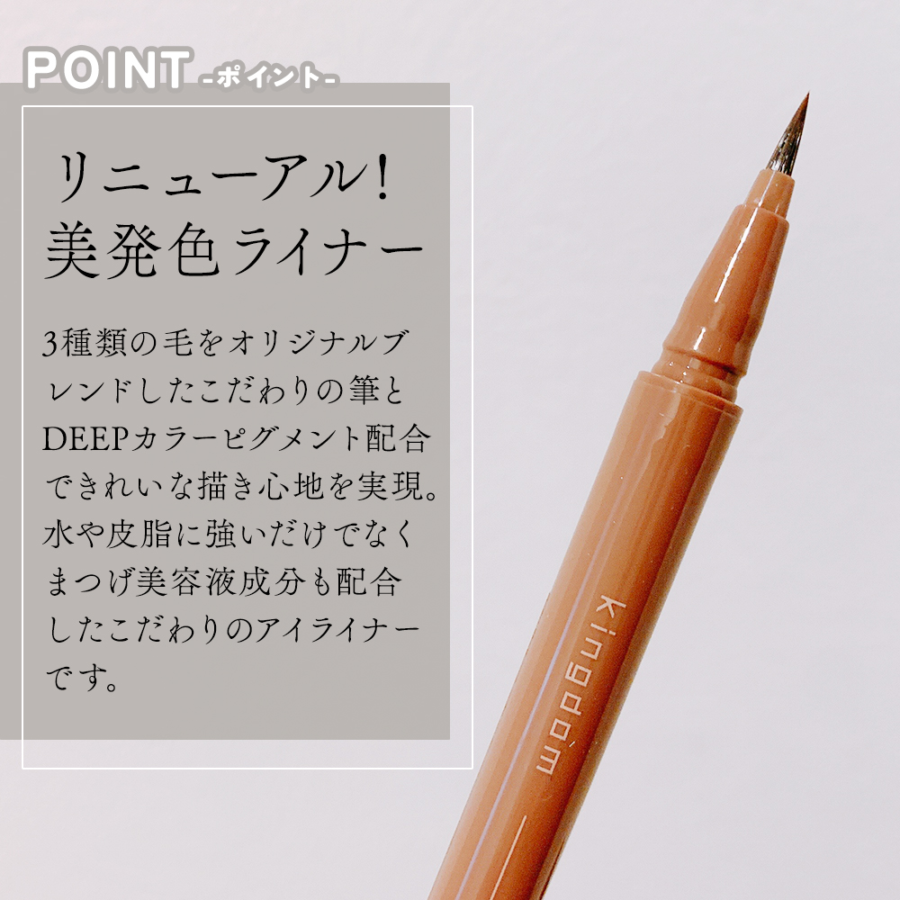 - リニューアル発売 描きやすさを追求した「オリジナル筆」。3種の毛をオリジナルブレンドし、驚きの描きやすさを実現。コシのある極細毛で目尻のハネも綺麗に描ける。鮮やかに発色する「DEEPカラーピグメント」を配合し、瞳をキレイに演出。水に強いウォータープルーフ、皮脂に強いスマッジプルーフのWプルーフ処方。まつ毛のすき間や目尻も描きやすい絶妙なコシのある極細毛。まつ毛美容液成分配合(保湿成分)。イージーオフ・染料不使用。通常のクレンジングでオフできる顔料タイプ。