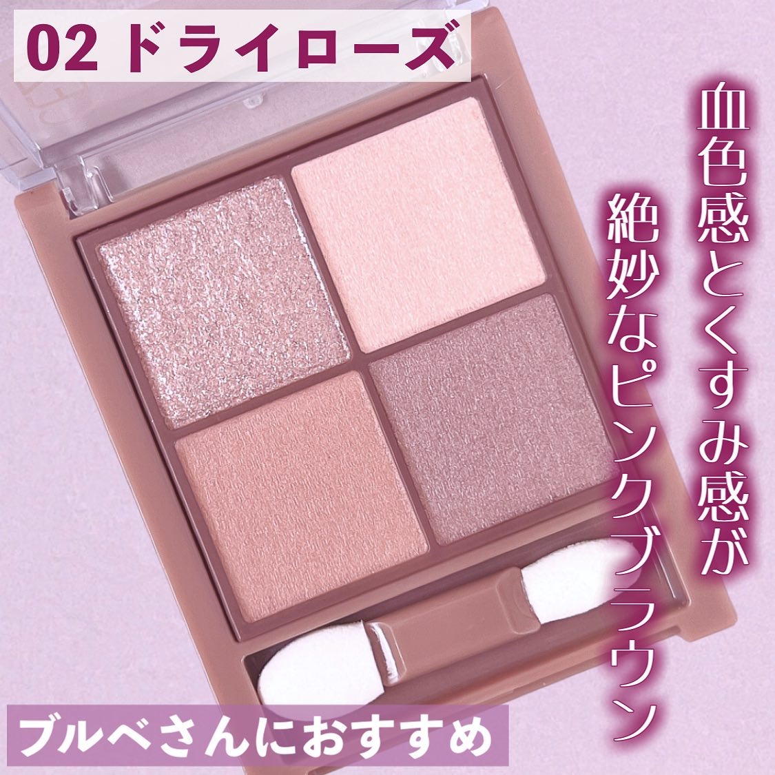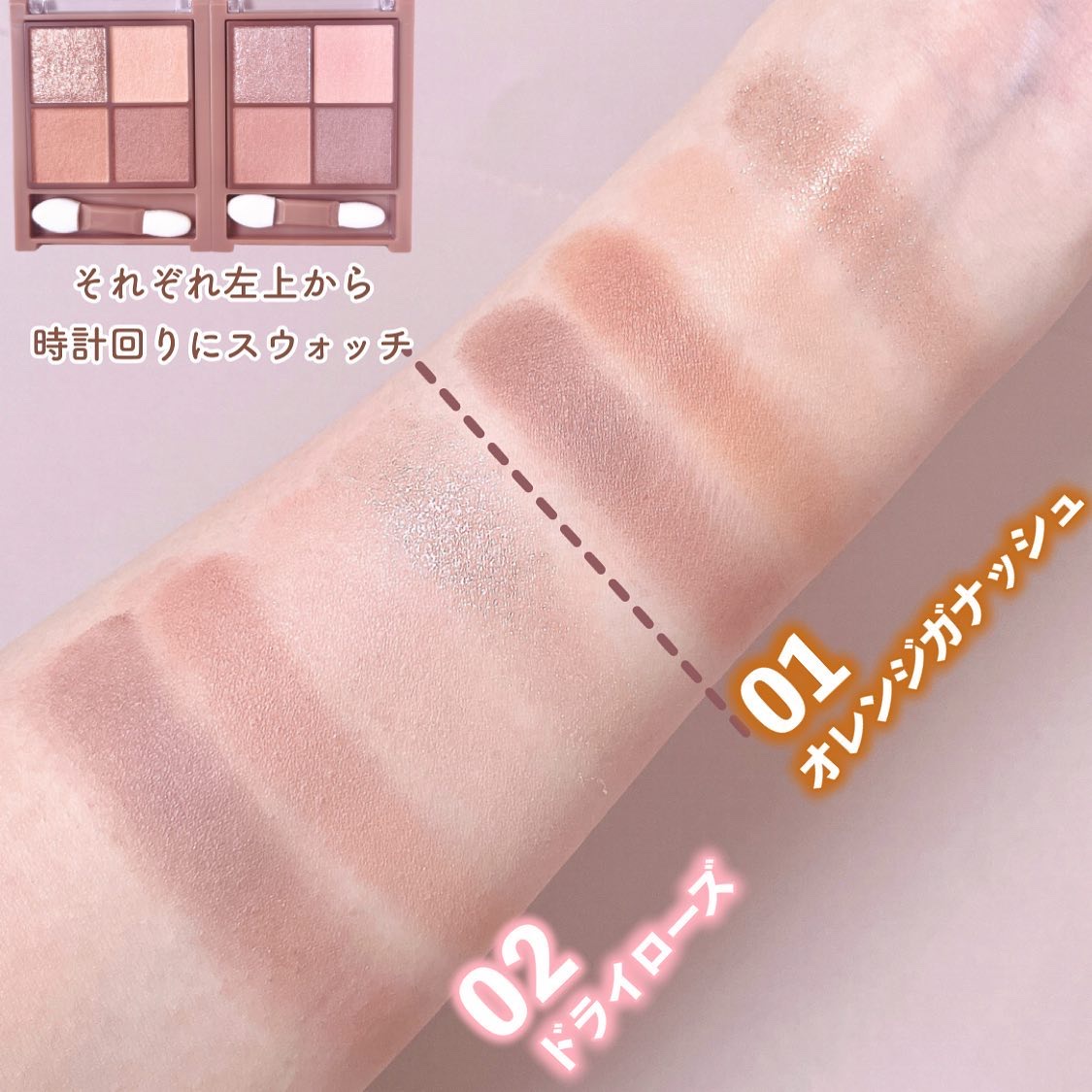 - 透け感マット×濃厚ブラウンの4色アイシャドウ。 しっかり目元を引き締めるビターなブラウンカラー。 透け感のあるブラウンを重ねて、自然な陰影のある目元へ。 ふんわり柔らかなパウダーなので、スルスル伸びてまぶたにピタッと密着。 保湿成分(スクワラン、ホホバ種子油)配合。