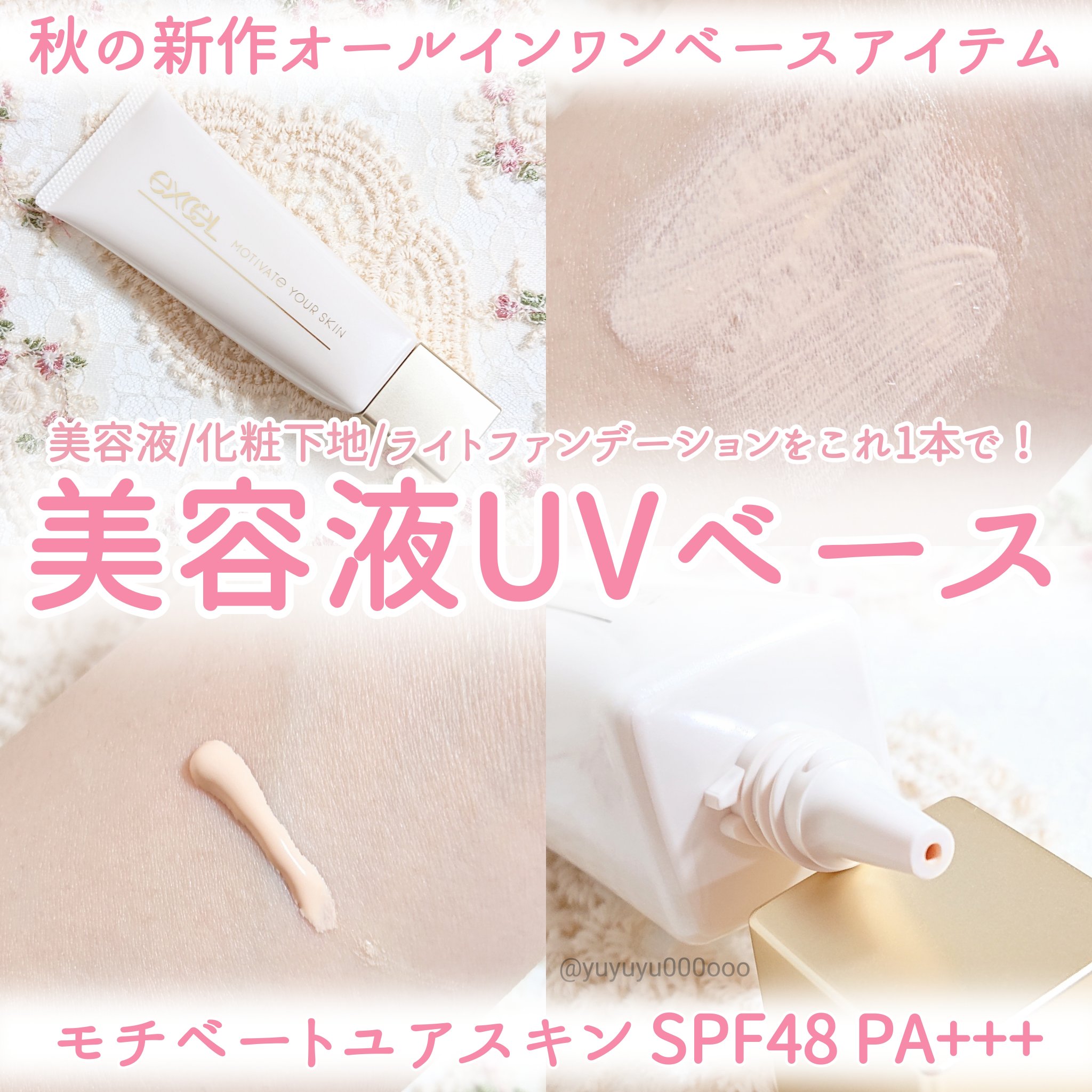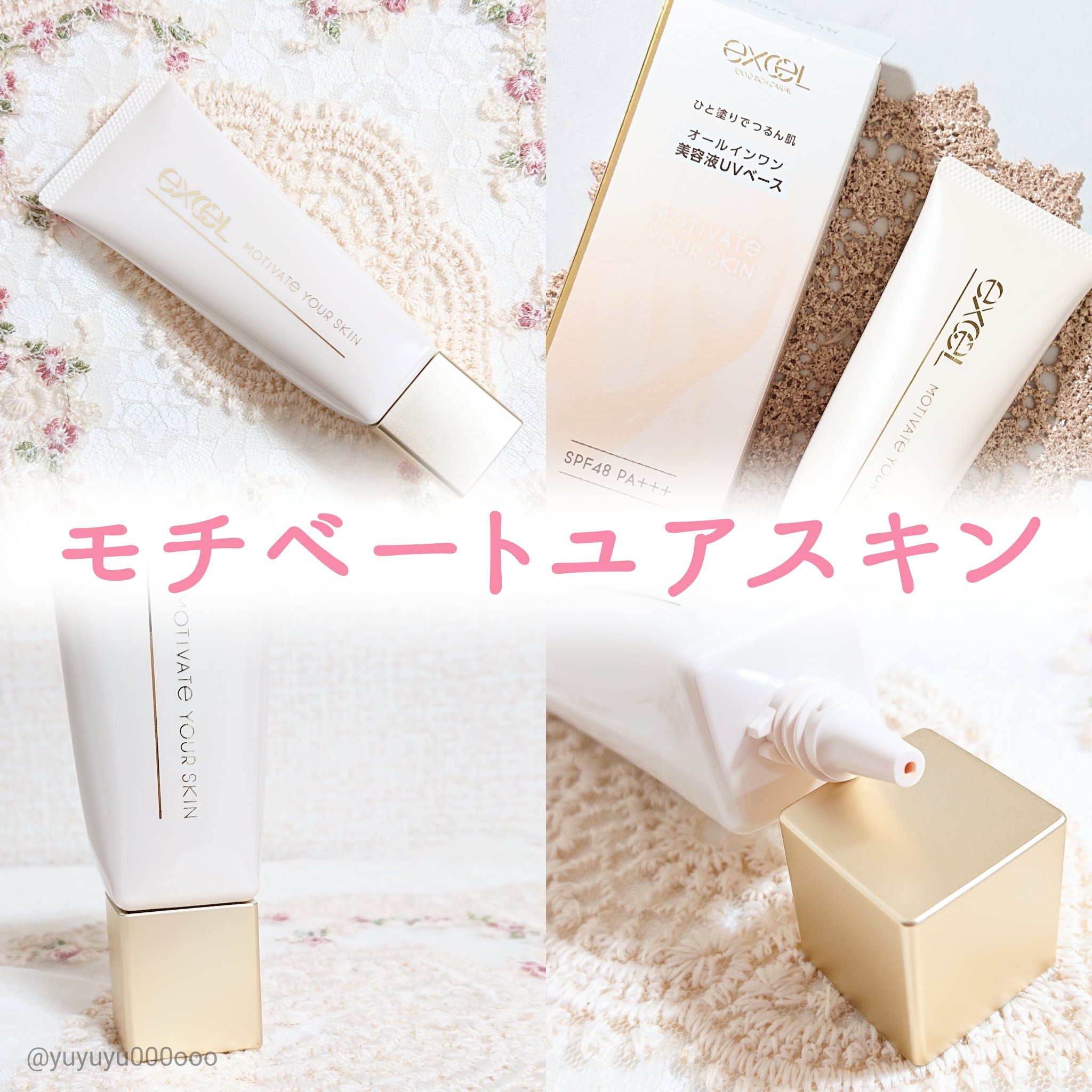 【🤍素肌感が叶うオールインワン美容液UVベース🤍】excelモチベートユアスキン ¥1,980\その魅力は/■化粧下地からライトファンデーションまでこれ1本■SPF48PA+++■美容液89%*2■石けんオフ\実際に使用してみて/まるでスキン...