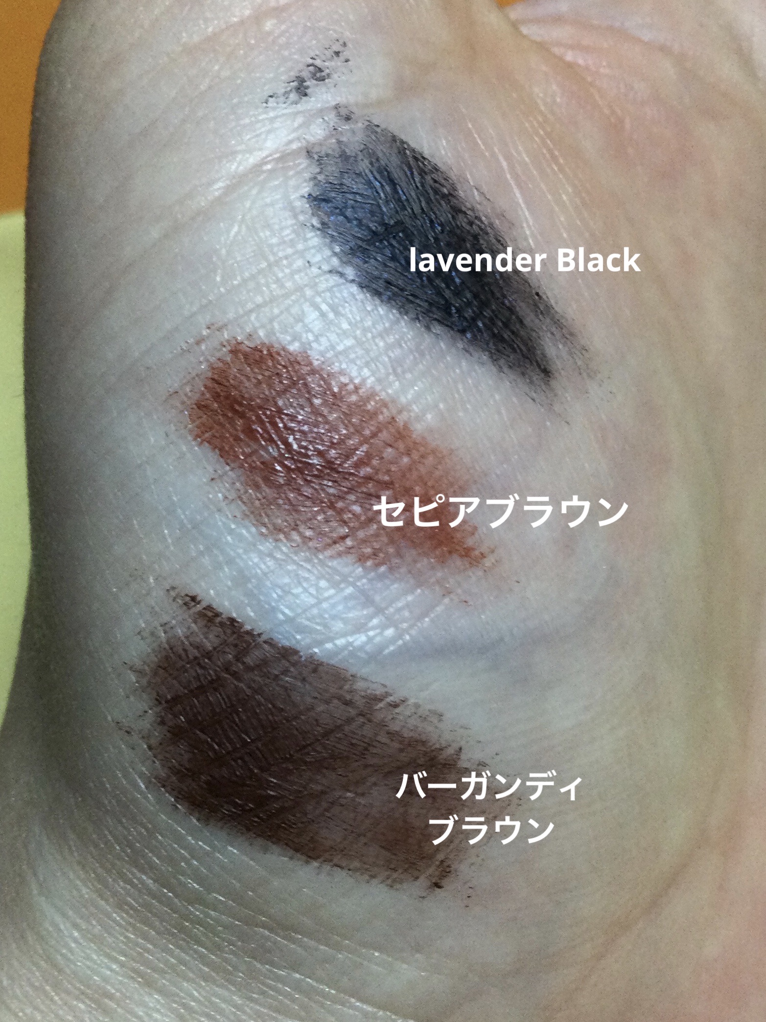 - <01 ラベンダーブラック> 水、トリ酢酸テトラステアリン酸スクロース、アクリレーツコポリマー、マイクロクリスタリンワックス、BG、エタノール、ステアリン酸スクロース、ポリビニルアルコール、ステアリン酸ソルビタン、ポリソルベート60、バチルアルコール、カルナウバロウ、ケイ酸(Al/Mg)、ポリアクリル酸Na、アルギニン、ヒアルロン酸Na、(メタクリル酸メチル/アクリロニトリル)コポリマー、DPG、オレス-50、ベントナイト、シリカ、PPG-2-デセス-30、ラウリル硫酸Na、シメチコン、(マレイン酸/ジイソブチレン)コポリマーNa、クエン酸、クエン酸Na、ラウレス硫酸Na、EDTA-2Na、炭酸Ca、トコフェロール、イソペンタン、イソブタン、フェノキシエタノール、デヒドロ酢酸Na、メチルパラベン、酸化鉄、マイカ、酸化チタン <02 バーガンディブラウン> 水、トリ酢酸テトラステアリン酸スクロース、アクリレーツコポリマー、マイクロクリスタリンワックス、BG、エタノール、ステアリン酸スクロース、ポリビニルアルコール、ステアリン酸ソルビタン、ポリソルベート60、バチルアルコール、カルナウバロウ、ケイ酸(Al/Mg)、ポリアクリル酸Na、アルギニン、ヒアルロン酸Na、(メタクリル酸メチル/アクリロニトリル)コポリマー、DPG、オレス-50、ベントナイト、PPG-2-デセス-30、ラウリル硫酸Na、シメチコン、(マレイン酸/ジイソブチレン)コポリマーNa、クエン酸、クエン酸Na、ラウレス硫酸Na、EDTA-2Na、シリカ、炭酸Ca、トコフェロール、イソペンタン、イソブタン、フェノキシエタノール、デヒドロ酢酸Na、メチルパラベン、酸化鉄、酸化チタン、マイカ <03 セピアブラウン> 水、トリ酢酸テトラステアリン酸スクロース、アクリレーツコポリマー、マイクロクリスタリンワックス、BG、エタノール、ステアリン酸スクロース、ポリビニルアルコール、ステアリン酸ソルビタン、ポリソルベート60、バチルアルコール、カルナウバロウ、ケイ酸(Al/Mg)、ポリアクリル酸Na、アルギニン、ラベンダー油、ヒアルロン酸Na、DPG、オレス-50、ベントナイト、PPG-2-デセス-30、ラウリル硫酸Na、シメチコン、(マレイン酸/ジイソブチレン)コポリマーNa、クエン酸、クエン酸Na、ラウレス硫酸Na、EDTA-2Na、酸化スズ、トコフェロール、フェノキシエタノール、デヒドロ酢酸Na、メチルパラベン、酸化鉄、合成金雲母、酸化チタン <04 ダスキーネイビー(限定)> 水、トリ酢酸テトラステアリン酸スクロース、アクリレーツコポリマー、マイクロクリスタリンワックス、BG、エタノール、ステアリン酸スクロース、ポリビニルアルコール、ステアリン酸ソルビタン、ポリソルベート60、バチルアルコール、カルナウバロウ、ケイ酸(Al/Mg)、ポリアクリル酸Na、アルギニン、ラベンダー油、ヒアルロン酸Na、DPG、オレス-50、ベントナイト、PPG-2-デセス-30、ラウリル硫酸Na、水酸化Al、シメチコン、(マレイン酸/ジイソブチレン)コポリマーNa、クエン酸、クエン酸Na、ラウレス硫酸Na、EDTA-2Na、酸化スズ、トコフェロール、フェノキシエタノール、デヒドロ酢酸Na、メチルパラベン、グンジョウ、酸化鉄、酸化チタン、合成金雲母