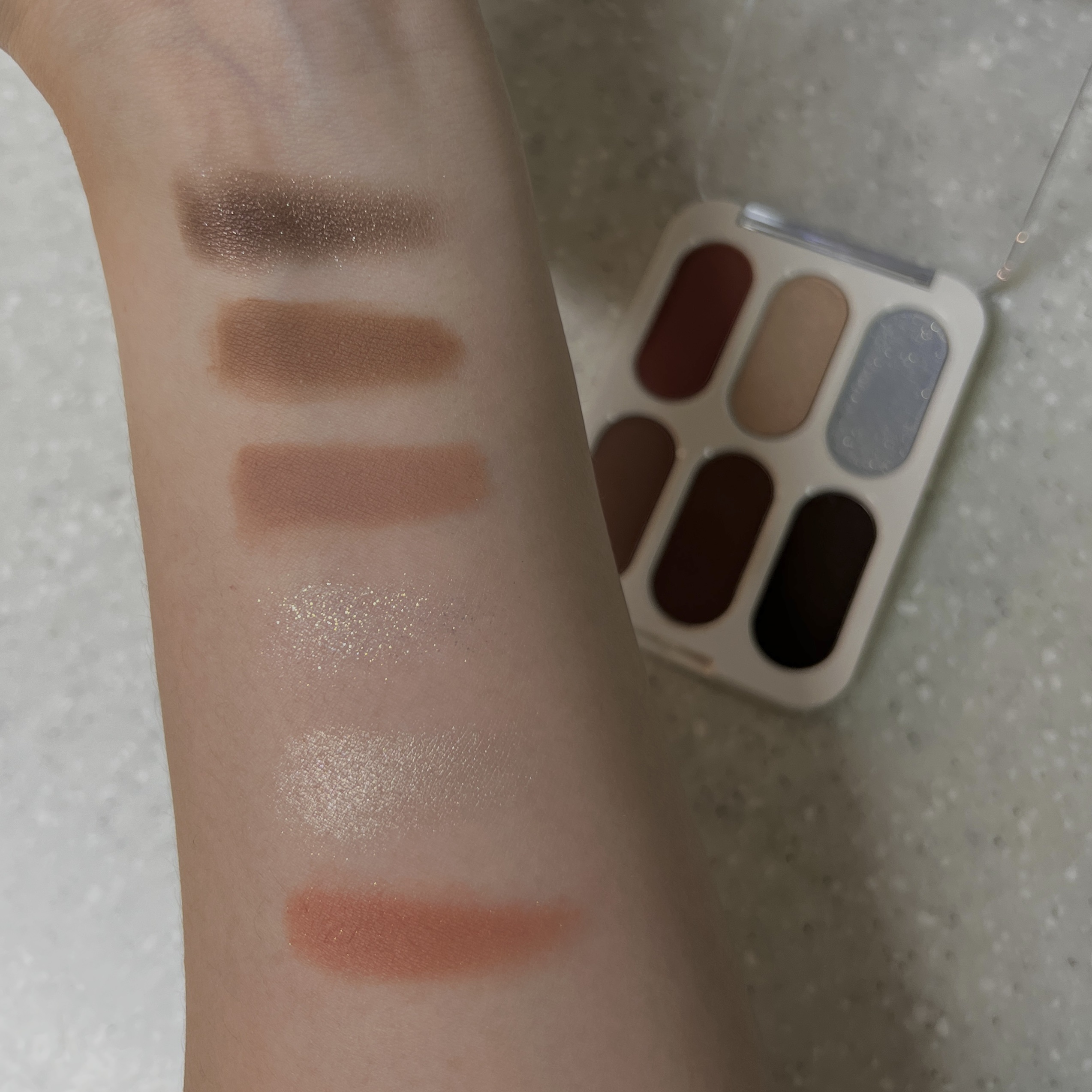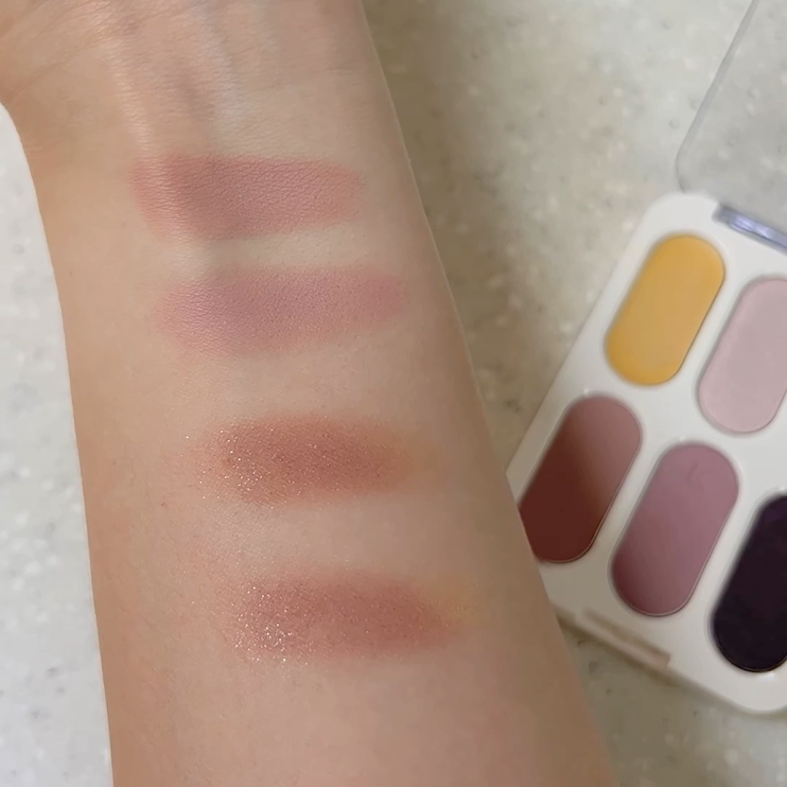 Lakaフォーエバー6アイパレット02 アテンションブルベ向け。全体的に紫がかった配色。④⑤のマットカラーは粉質が結構きめ細かいけどややパサパサしてる。似た粉質のウェイクメイクの16色パレットの方がしっとりしてる。①を使うとニュアンスチェンジ...