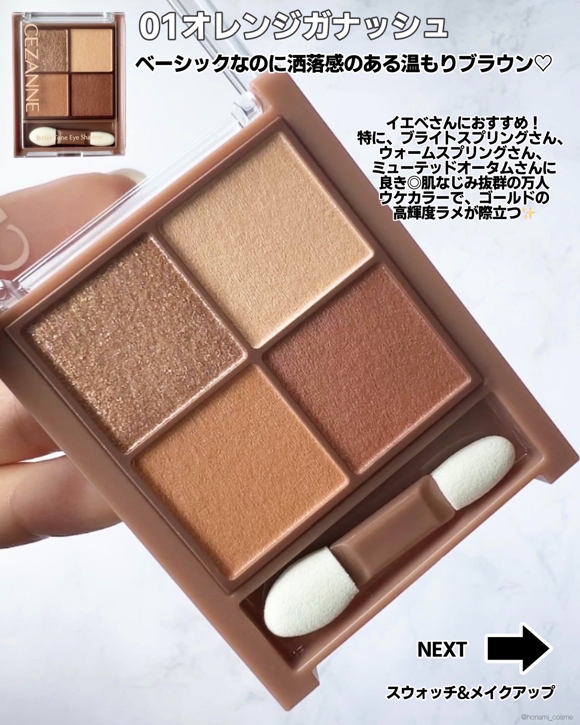 セザンヌビタートーンアイシャドウ01オレンジガナッシュ『ベーシックなのに洒落感のある温もりブラウン』・濃厚ブラウンで自然な陰影のある目元に・重ねてもくすみにくい、透け感のあるマットカラー・クリア発色のラメをプラスすると 立体感と華やかさを演出...