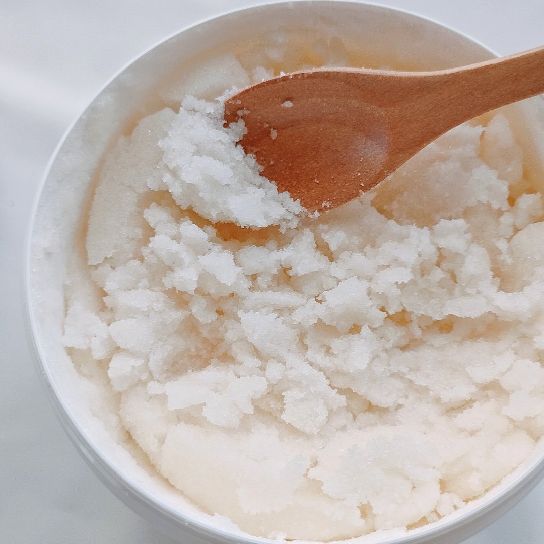 シャーベットのようなやわらかさで ゴリゴリ感がなく優しい使い心地だから 敏感肌の方にもおすすめ♡ かかと、肘、膝などの角質ケア お湯と混ぜてペーストにして頭皮マッサージ お湯で伸ばした塩湯をシャンプー後にかけ流して美髪ケア ヒップマッサージで美尻ケア 足のニオイケア