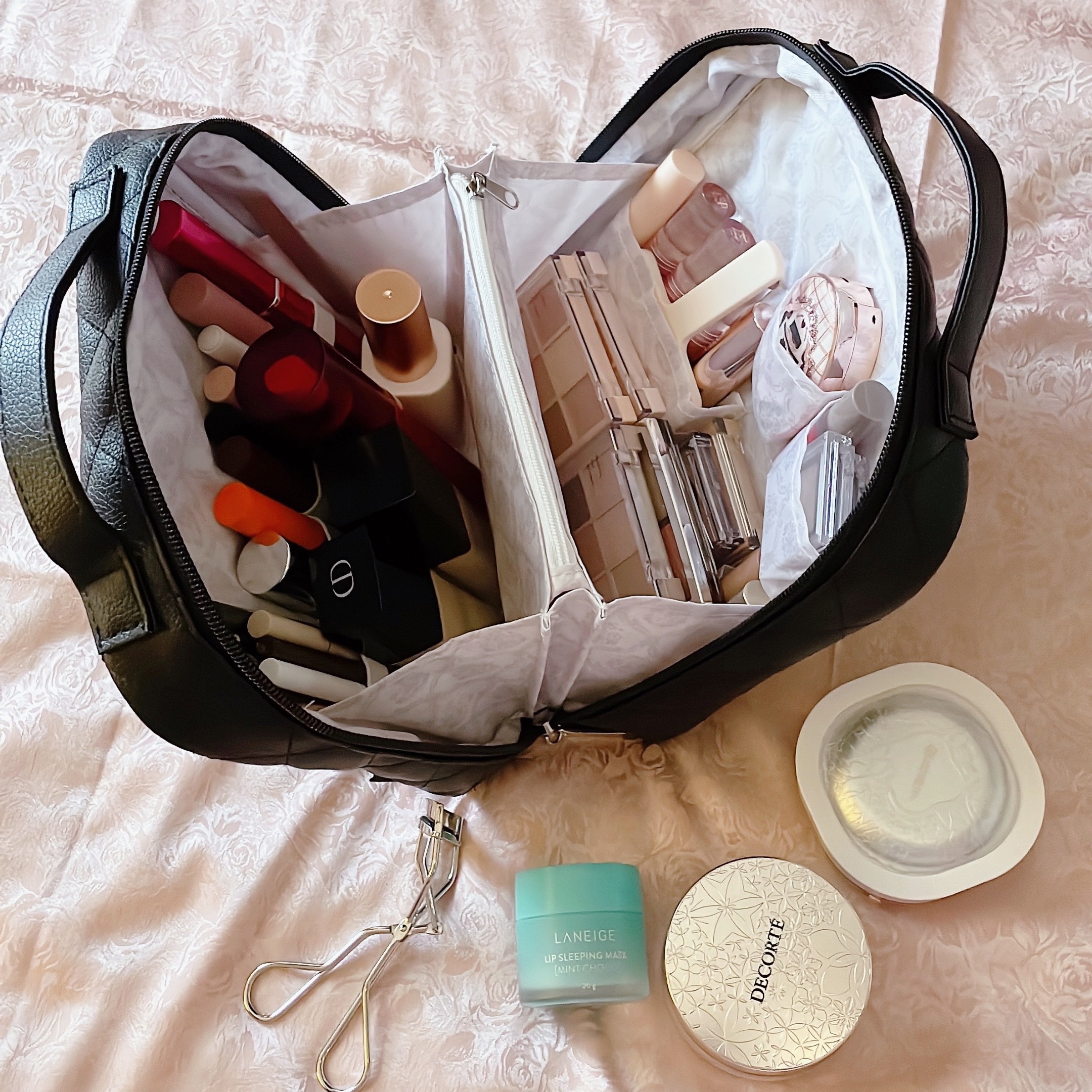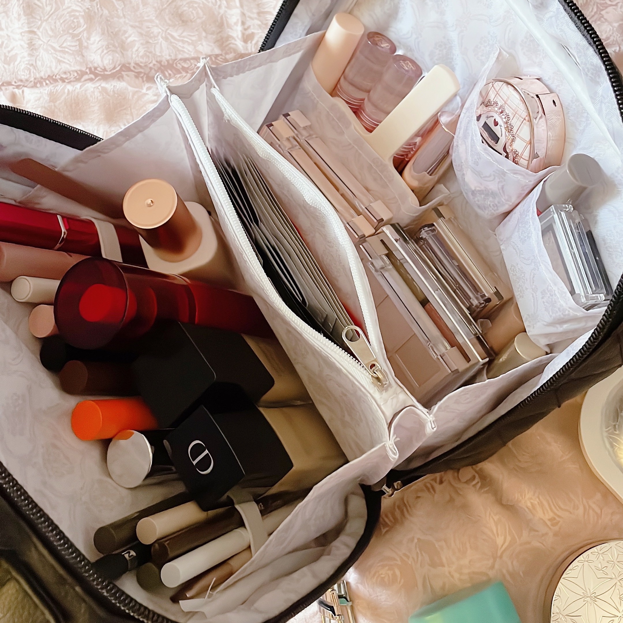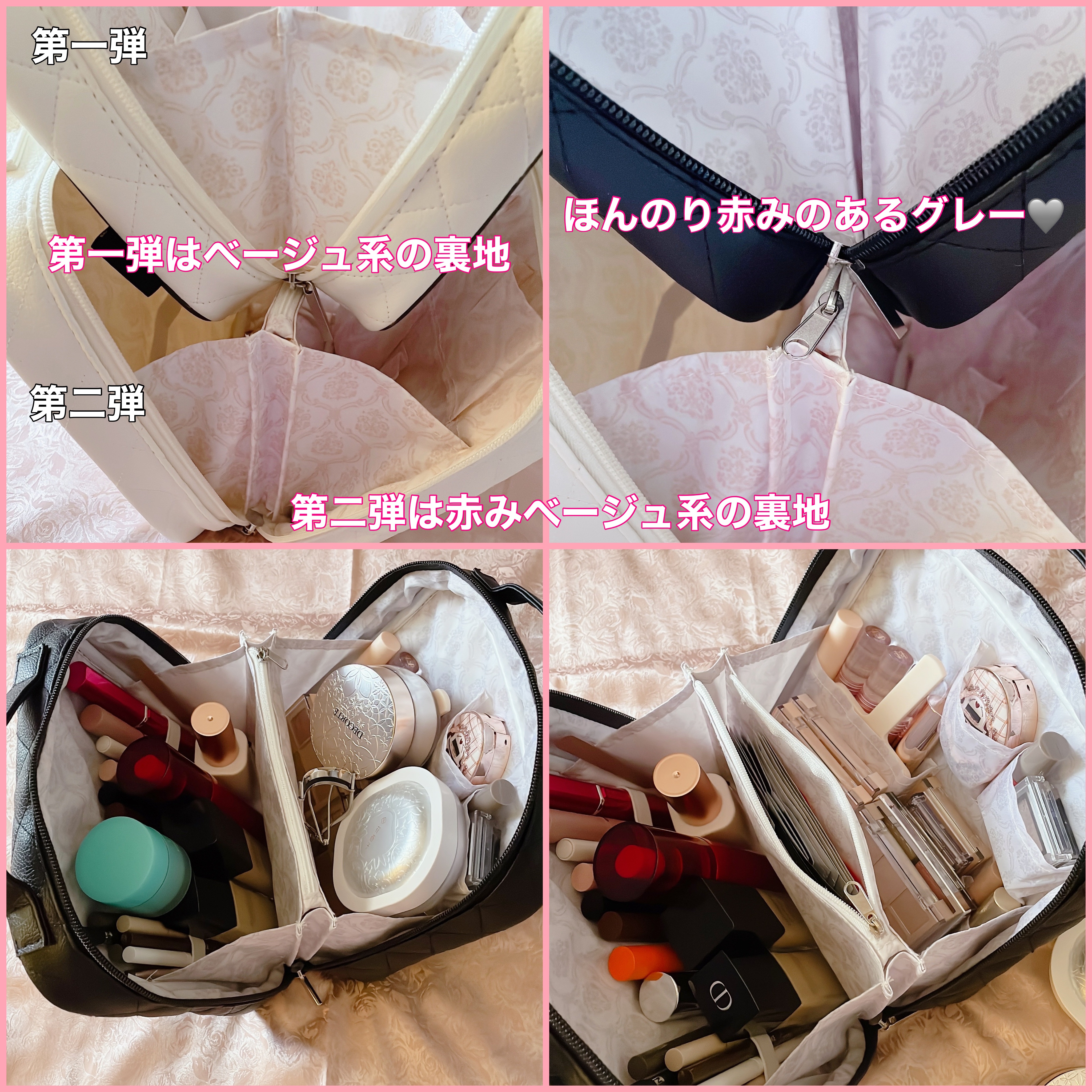 第一弾からさらに大きくなったコスメポーチ♡ 美容系YouTuberななこちゃんならではの視点やこだわりが詰まった大人気のポーチです❤️ サイズUPでさらに大容量 中央に仕切りポケットが付いた! 2段式のマチ付きポケットが3つ→5つに♡ 長いブラシも立てて収納 ファスナーが1つに対してダブルファスナーになった✨ 大きく開ける自立型 フラットな外ポケット 機能的で上品なデザイン 機能性、デザイン、使いやすさで、お値段以上の価値があった。 見た目が上品で持っていると褒められる。 使いやすさ! 収納ポケットが増えたり、上段のデッドスペースももう1カ所増えたことで単色のアイシャドウやサンプルサイズの下地やリップが入れられたりと嬉しい工夫が♡ 使い方を限定するのは好きじゃないから、とポケットをあまり増やしたくないというななこちゃんですが、ポケットの部分以外もコスメが入れられるので安心☺️🌼 ルルシャルムの裏地も上品で可愛い❤️ ホワイト、ブラック、どちらも上品で裏地が可愛く収納力も優秀で気に入ってます🥰