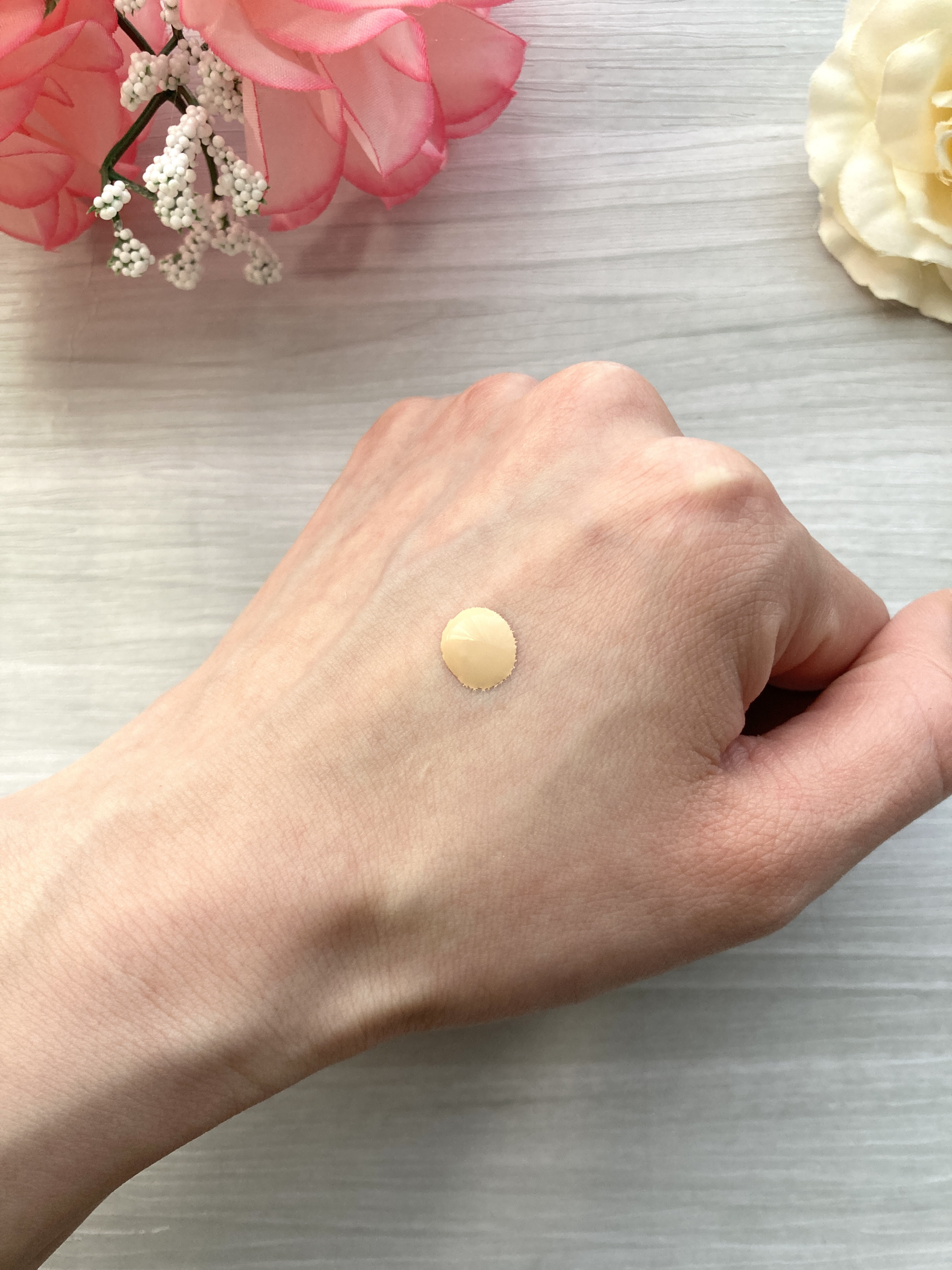 さらさらで伸びが良いテクスチャー。 肌への密着感もあって、ピンクベージュの色みが毛穴のカバーとほんんのりトーンアップも。 クリームのようなテクスチャー。 肌にのせすぎると白っぽくなるので、少しずつ伸ばすのが◎ なめらかテクスチャー。 細かいパールが入ってますが、ギラギラしたりもなく自然な感じ。