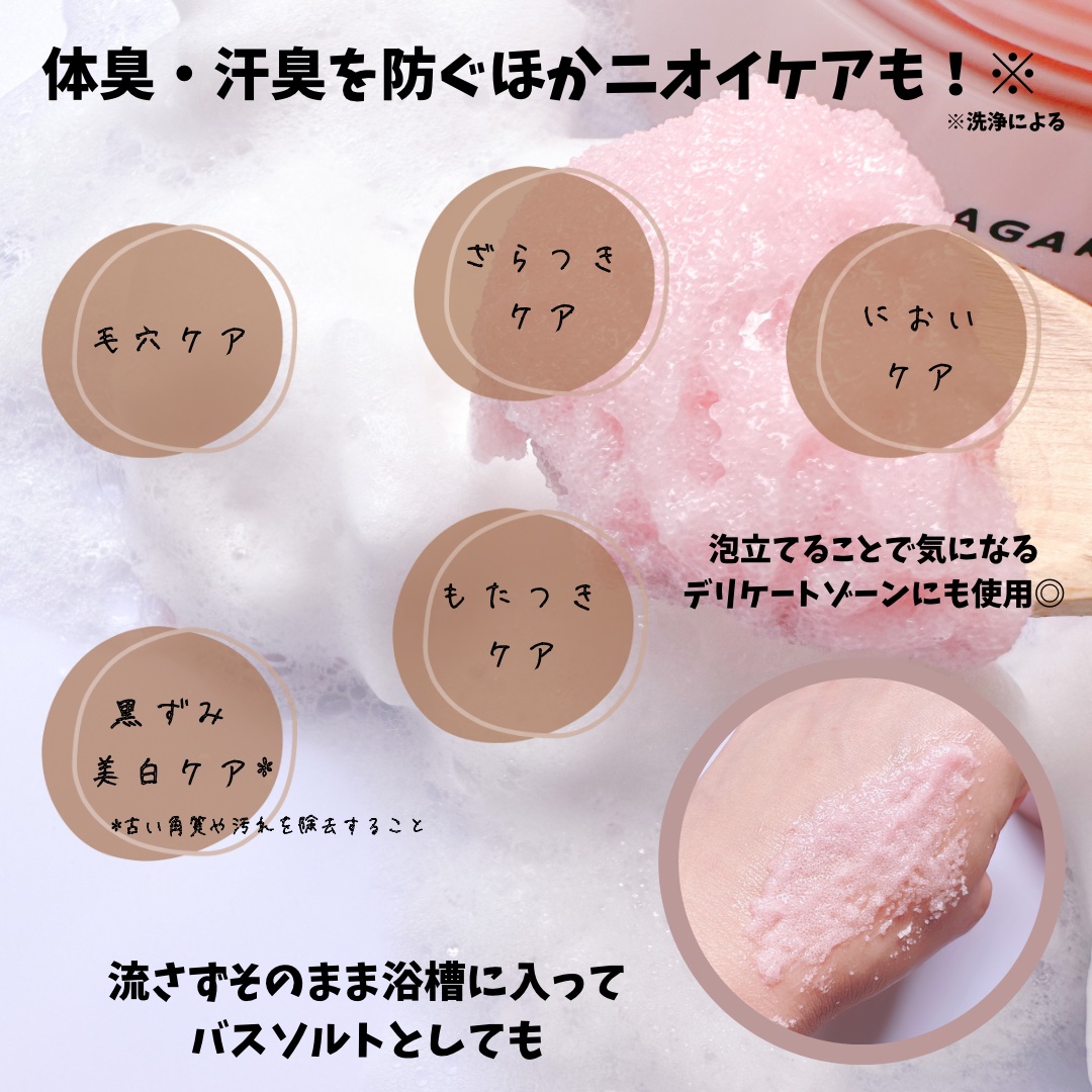 - 美容をもっとカジュアルに“AGARISM”とカワイイの欲望を知り尽くした雑誌sweetとのコラボ商品!女性のボディを魅力的にする重要なパーツ「お尻」。古い角質による黒ずみやザラツキ・乾燥ニキビ*などをケア。角質が気になるところにはスクラブとして、気になるデリケートゾーンは泡立てて全身ボディソープとしてOK。バスソルトとしても使える3WAYボディスクラブです。香りもやみつきになるフェロモンな香りにうっとりします! *洗浄によりニキビを防ぐ