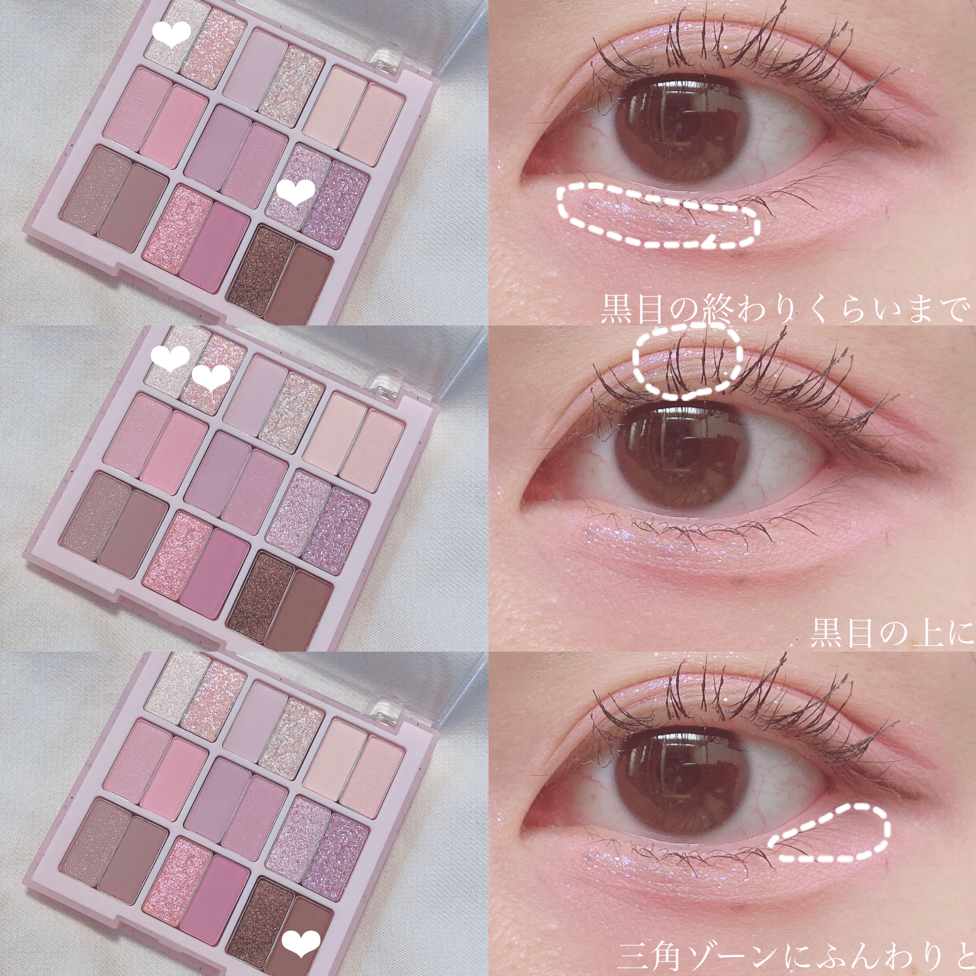 アイシャドウ👀・CLIOプロ アイ パレット01SIMPLY PINK グリッター✨・PERIPERAデュオ ポケット グリッター シャドウ03SALTED SUGARPLUM 涙袋のコンシーラー👧・キャンメイクカラーミキシングコンシーラーオレンジベージュ マスカラ💇♀️・rom&ndハンオールフィックスマスカラL02LONG ASH アイライン✏️・キャンメイククリーミータッチライナーダークブラウン・CEZANNE極細アイライナーEX20ブラウン