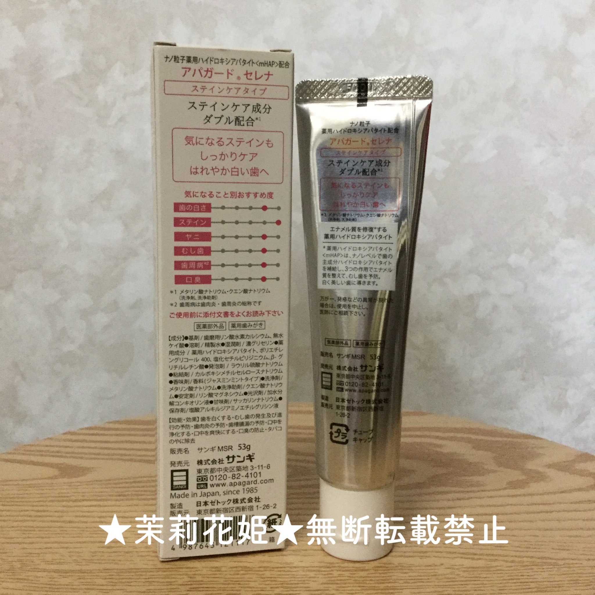 - 【医薬部外品】 美白歯みがき「アパガード」シリーズのステインケアタイプ。サンギ開発のむし歯予防成分「薬用ハイドロキシアパタイト」を配合。歯とほぼ同じ成分(歯のエナメル質の97%はハイドロキシアパタイト)で、エナメル質にアプローチ! さらにステインケア成分をダブル配合*し、コーヒーや紅茶・ワインなどの気になる着色汚れを落とします。 ステインケアではれやか白い歯に。 *メタリン酸ナトリウム(洗浄剤)・クエン酸ナトリウム(洗浄助剤) ●医薬部外品/薬用歯みがき 販売名:サンギMSR