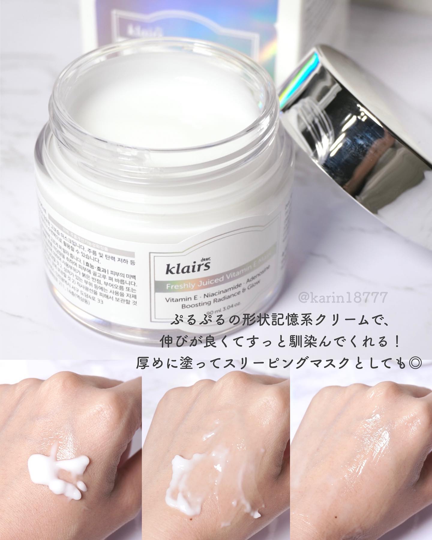 klairsフレッシュリージュースドビタミンEマスク¥2,700(Qoo10価格)klairsで人気のビタミンEマスクをブランド様よりプレゼントいただきました🎁抗酸化作用、美白効果のあるビタミンEと美白、シワ改善効果のあるナイアシンアミド、エ...