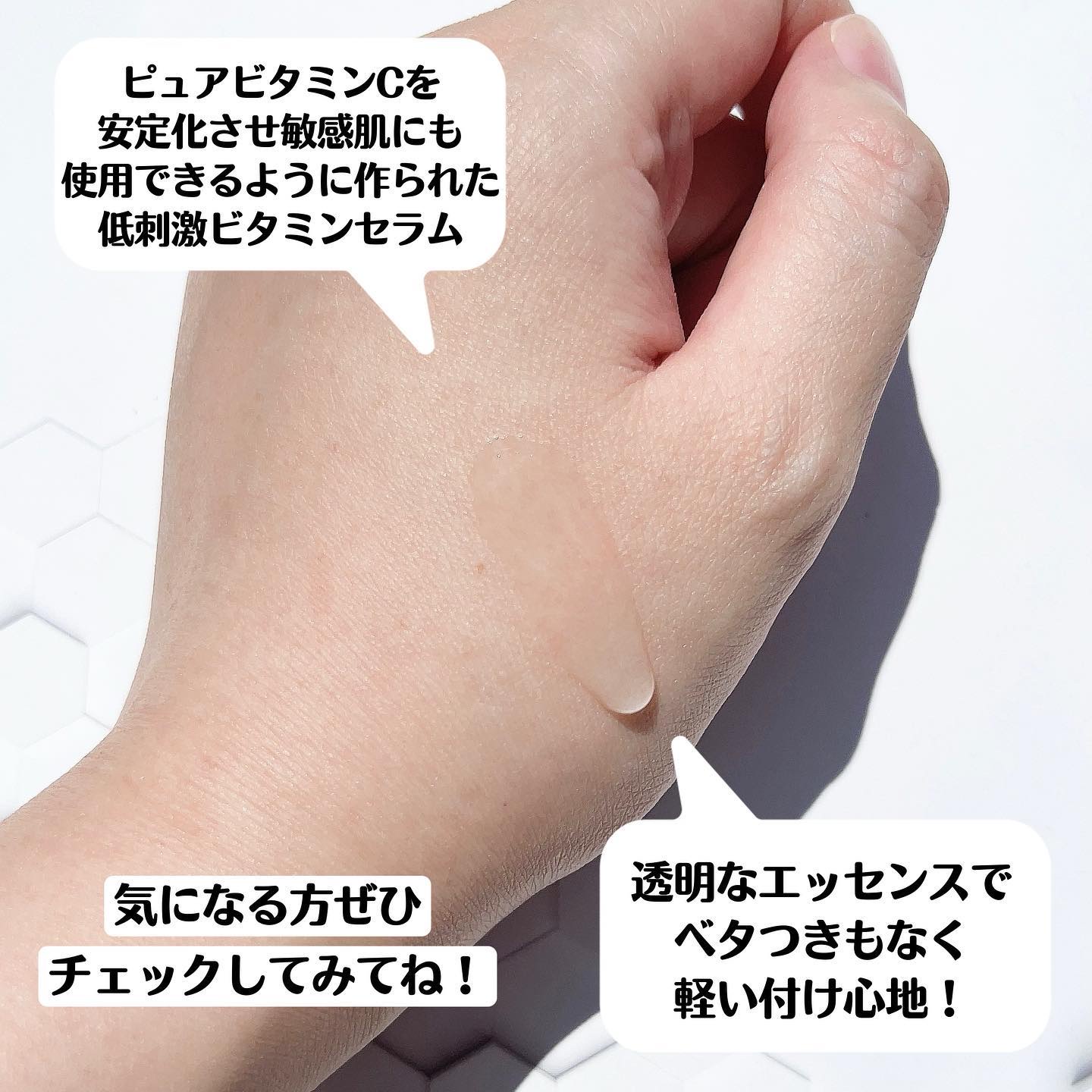 透明のとろみのあるテクスチャーで、スーッと肌に馴染み、ベタつきはなく、少しするとサラッとしてみずみずしい使い心地です✨ ハンドプレスすると、しっとりモチモチの肌になっているのを実感しました◎ 爽やかなシトラスの香りも癒されます💕 スポイトタイプなので、量も調節しやすく、衛生面も安心で使いやすいです!