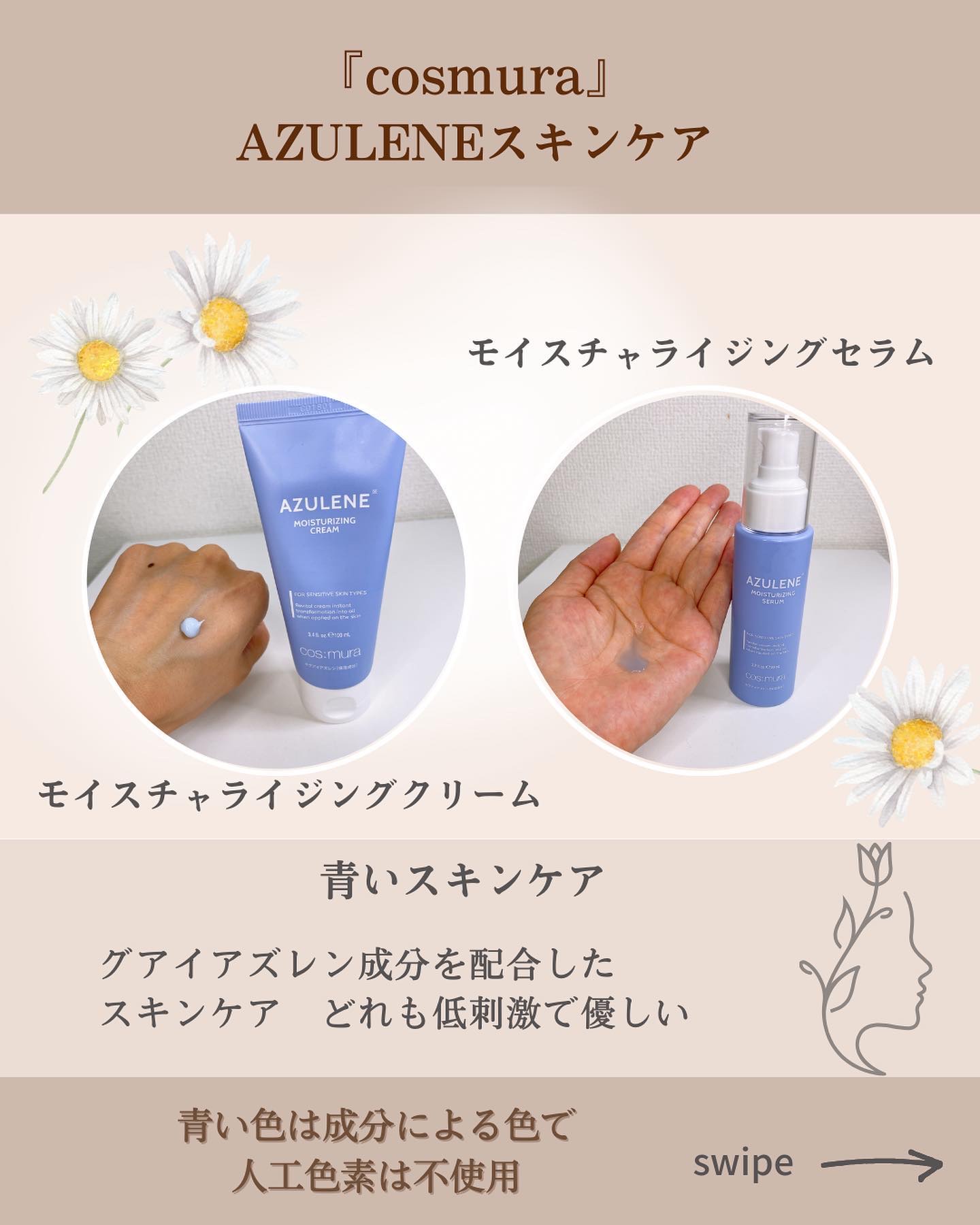 ポンプタイプで出す化粧水🧴 なんとこの化粧水250mlと大容量! なので惜しむことなくパシャパシャ使える😆 乾燥肌、脂性肌どちらにも使えるクリーム! こちらも100mlという大容量サイズ🧴 少し青みがある商品なのですが人工色素ではなくアズレン成分の青み🫧 安心して使うことができました✨