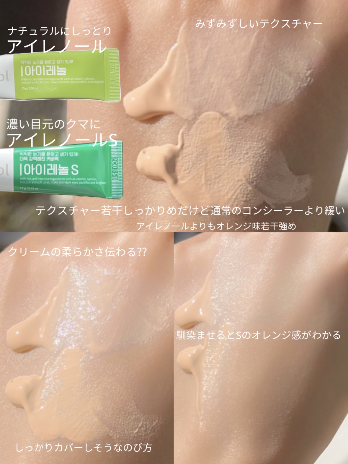 - <アイレノール クマクリーム> 水、シクロペンタシロキサン、グリセリン、ナイアシンアミド、ツボクサ葉エキス、サンゴエキス、パンテノール、イソヘキサデカン、ヒドロキシエチルウレア、ジメチコノール、アラントイン、グリチルリチン酸2K、プロパンジオール、カプリルヒドロキサム酸、香料、オリーブ果実油、酢酸トコフェロール、ホホバ種子油、オレイン酸ソルビタン、アルガニアスピノサ核油、アデノシン、エチルヘキシルグリセリン、プルラン、ヒアルロン酸Na、EDTA-2Na、トリデセス-6、DNA-Na、(アクリル酸グリセリル/アクリル酸)コポリマー、リノール酸グリセリル、ペンチレングリコール、リノレン酸グリセリル、アラキドン酸グリセリル、パルミチン酸レチノール、ラウリン酸K、ピーナッツ油、ヒアルロン酸クロスポリマーNa、トマト果実エキス、ブロッコリーエキス、ケール葉エキス、キャベツ葉エキス、チャ葉エキス、レモン果実エキス、アスパラガスエキス、フラガリアチロエンシス果実エキス、カキ葉エキス、トウガラシ果実エキス、水溶性プロテオグリカン、アスタキサンチン、ヒアルロン酸、トコフェロール、パルミチン酸アスコルビル、酸化チタン、酸化鉄、他 <アイレノール クマクリームS> 水、シクロペンタシロキサン、グリセリン、ナイアシンアミド、ツボクサ葉エキス、サンゴエキス、パンテノール、イソヘキサデカン、ヒドロキシエチルウレア、ジメチコノール、アラントイン、グリチルリチン酸2K、プロパンジオール、カプリルヒドロキサム酸、香料、オリーブ果実油、酢酸トコフェロール、ホホバ種子油、オレイン酸ソルビタン、アルガニアスピノサ核油、アデノシン、エチルヘキシルグリセリン、プルラン、ヒアルロン酸Na、EDTA-2Na、トリデセス-6、DNA-Na、(アクリル酸グリセリル/アクリル酸)コポリマー、リノール酸グリセリル、ペンチレングリコール、リノレン酸グリセリル、アラキドン酸グリセリル、パルミチン酸レチノール、ラウリン酸K、ピーナッツ油、ヒアルロン酸クロスポリマーNa、トマト果実エキス、ブロッコリーエキス、ケール葉エキス、キャベツ葉エキス、チャ葉エキス、レモン果実エキス、アスパラガスエキス、フラガリアチロエンシス果実エキス、カキ葉エキス、トウガラシ果実エキス、水溶性プロテオグリカン、アスタキサンチン、ヒアルロン酸、トコフェロール、パルミチン酸アスコルビル、酸化チタン、酸化鉄、他