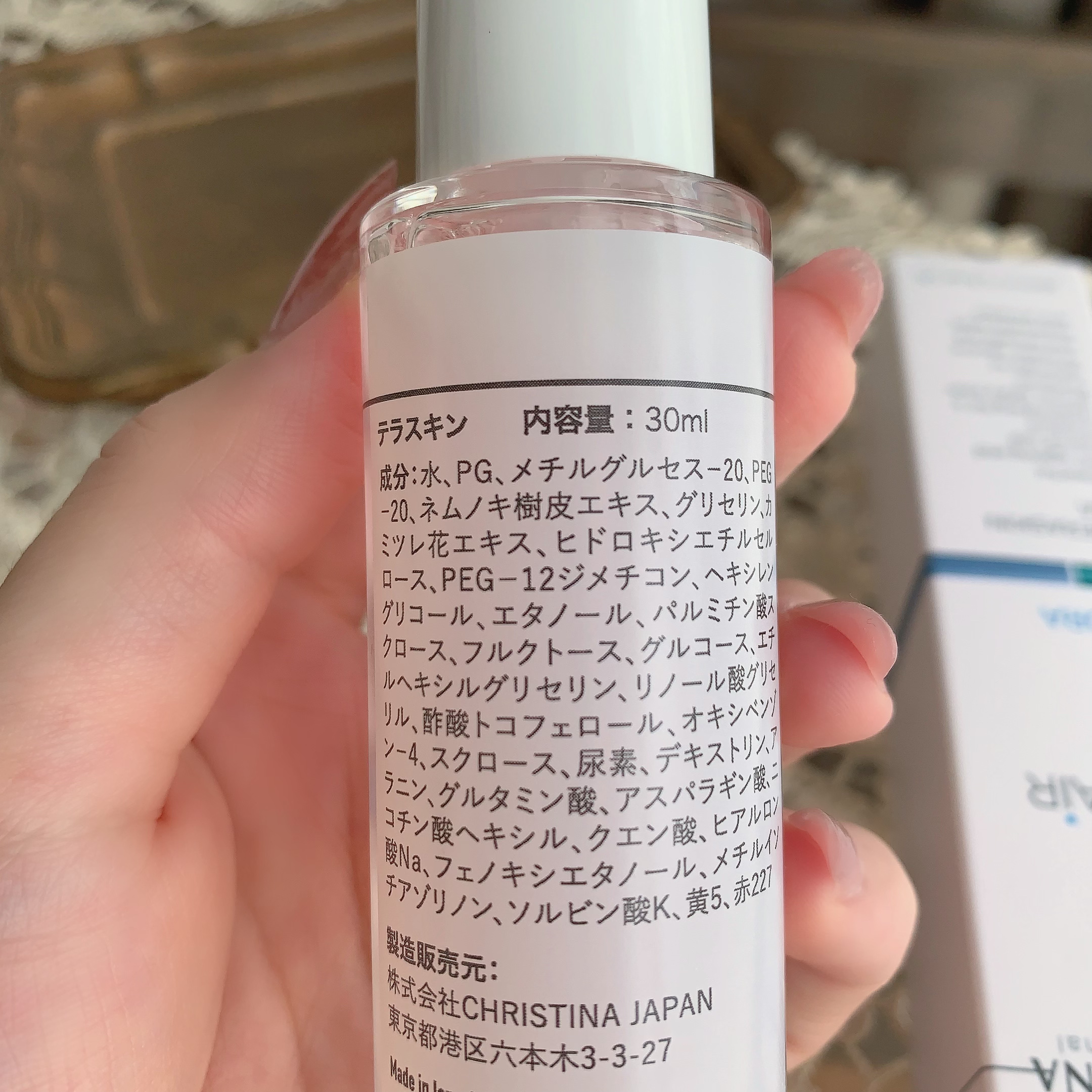 クリスティーナのアイコン的アイテム「テラスキン」 なんと田中みな実さんも絶賛しているんです✨ 40年以上、世界60カ国で愛され続けているこの美容液は、肌の水分レベルをしっかりと維持するために開発されました。 テラスキンを使うと、翌朝の肌がまるで水分で満たされているかのような感覚になるので、化粧ノリも断然良くなります。