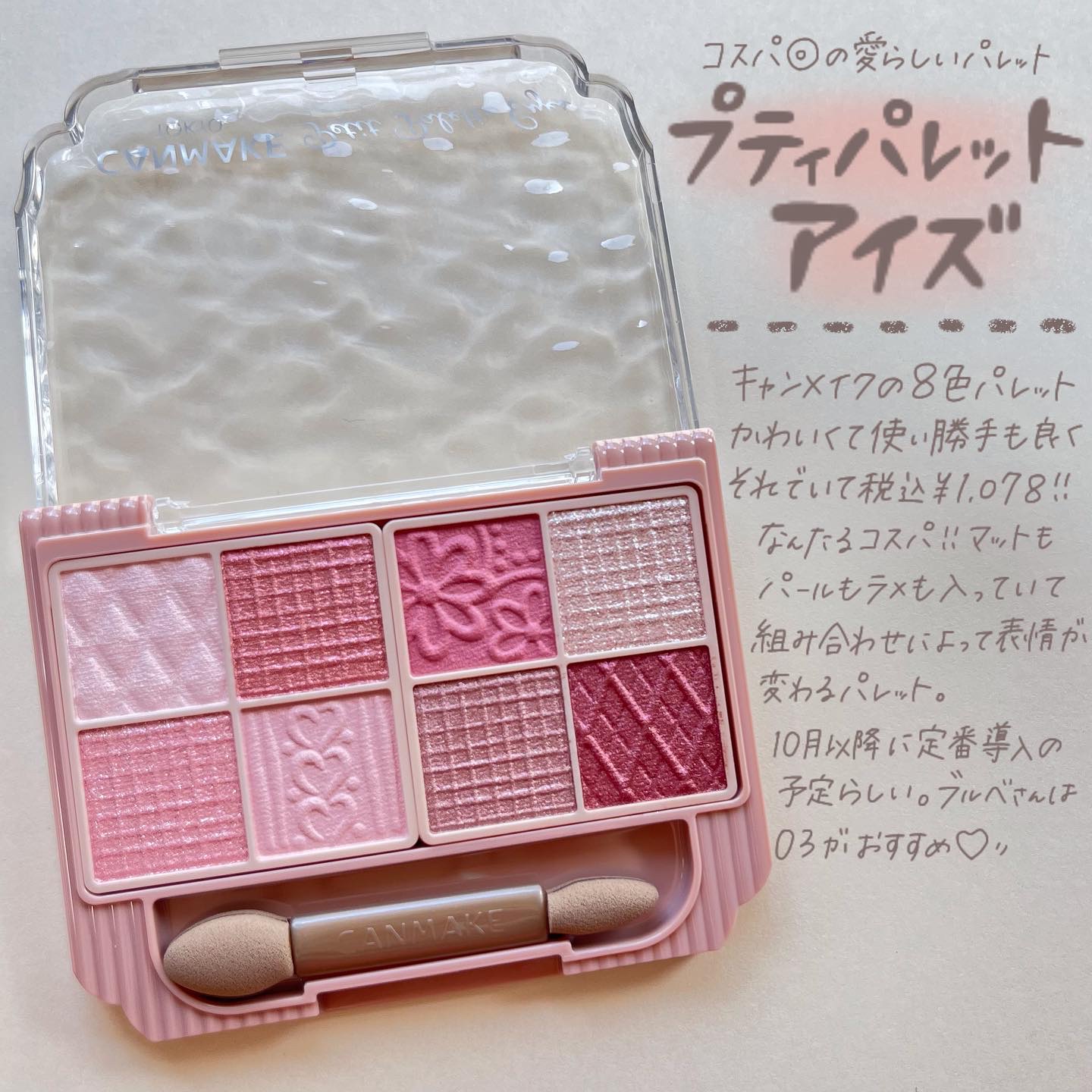 - 持ち歩ける多色パレットがキャンメイクから登場! 捨て色なしの8色入り&チップ付! 「持ち歩けること」や「外出先でもメイク直しができること」を重視した多色パレット。 持ち運びやすいサイズ感なのに、贅沢に8色入りです。 さらに便利なダブルエンドチップまで! マット×パール×ラメなど、組み合わせ方はあなたの自由! 自分好みのアイメイクを楽しめます。