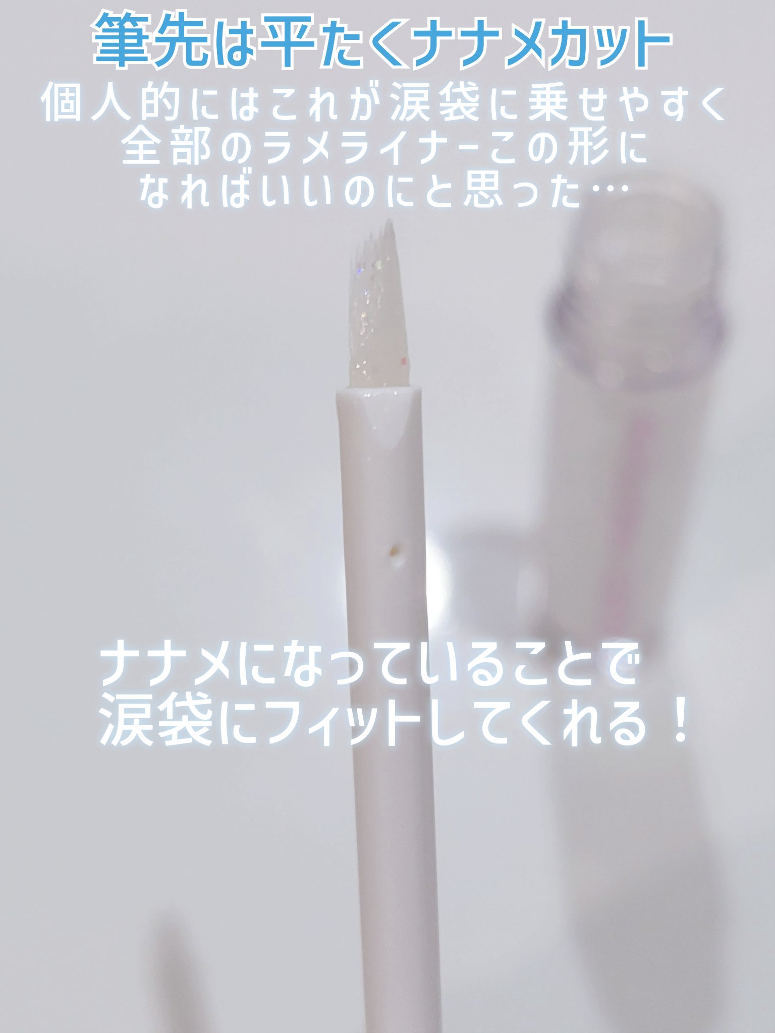 - ダイヤモンドのような輝きで目元キラめくグリッターライナー ○高密着ウォーターベース みずみずしく、まぶたへぴたっと密着 ○オリジナル斜めカット筆 自由自在に線を描ける斜めカット平筆 狙った場所にラメをのせることができます。 ○うるおう美容液成分in 5種のトリートメント成分*1と2種の植物エキス*2 *1 ナイアシンアミド、スイゼンジノリ多糖体、加水分解コラーゲン、パルミトイルトリペプチド-5、ヒアルロン酸Na(すべて保湿成分) *2 ツボクサ葉/茎エキス、アロエベラ葉エキス(すべて保湿成分)