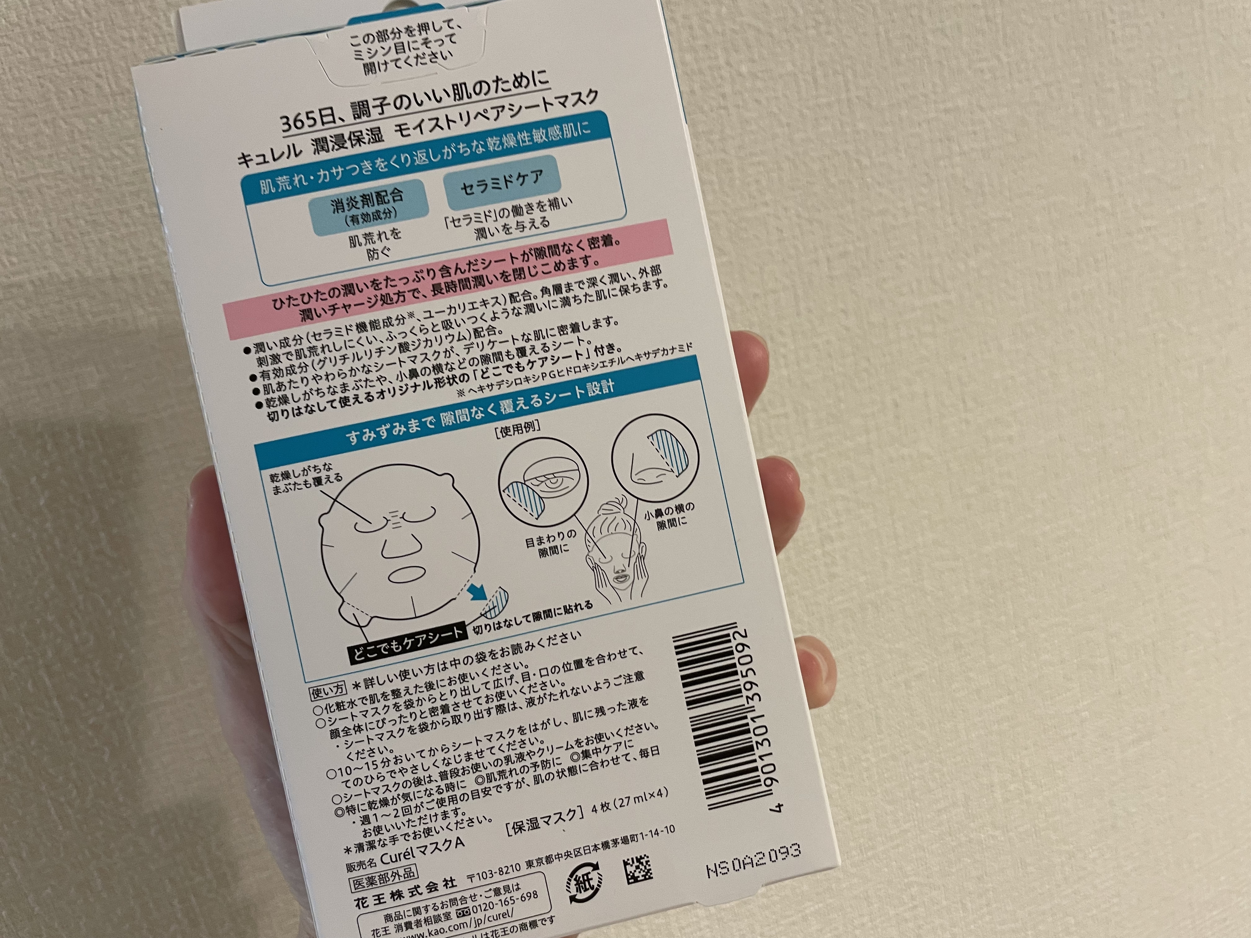 - 【敏感肌用】 潤いひたひたでやさしい感触のシートでじっくりとケアして、セラミドの働きを補い、濃密な潤いをすみずみまで補給。 潤いチャージ処方で、長時間潤いを閉じこめる。 ●消炎剤(有効成分)配合。肌荒れを防ぐ。 ●肌あたりやわらかなシートマスクが、デリケートな肌に密着。 ●乾燥しがちなまぶたや、小鼻の横などの隙間も覆えるシート。切りはなして使えるオリジナル形状の「どこでもケアシート」付き。 (医薬部外品) 商品に関するお問い合わせ 受付時間9:00~17:00(土曜・日曜・祝日除く) *製品の誤飲・誤食など緊急の場合は、受付時間外でもお電話ください キュレル:0120-165-698
