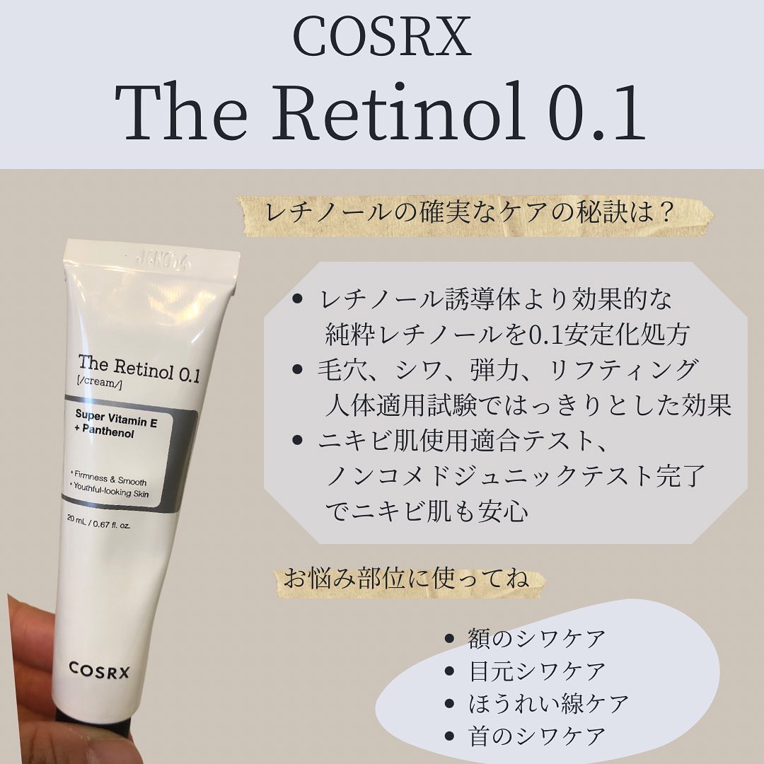 テクスチャーがこくのあるしっかりしたもので、有効成分がたくさんつまっている感じ😊特に今話題のレチノールが入っているのも大きなポイントです! 伸びも良く、少量でぬれるからコスパは最強。目元だけじゃなく、口元やしわが気になる所に塗ってケアできるよ😊 スキンケアの最後に適量をとり、やさしくなじめて塗ってくださいね😊