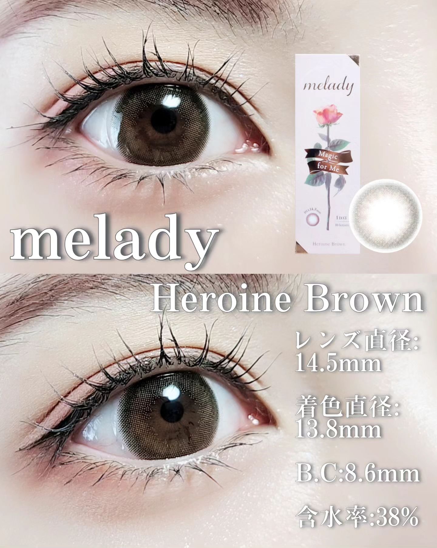 \既存色3色がマンスリーになって登場🎀/.melady¥1400(税抜)/2枚.DIA14.5mm着色直径13.8mmBC8.6mm含水率38%着画:マンスリーレンズ▪️アイドルリング細フチ×ちゅるんブラウン少しくすみも感じるようなナチュラル...