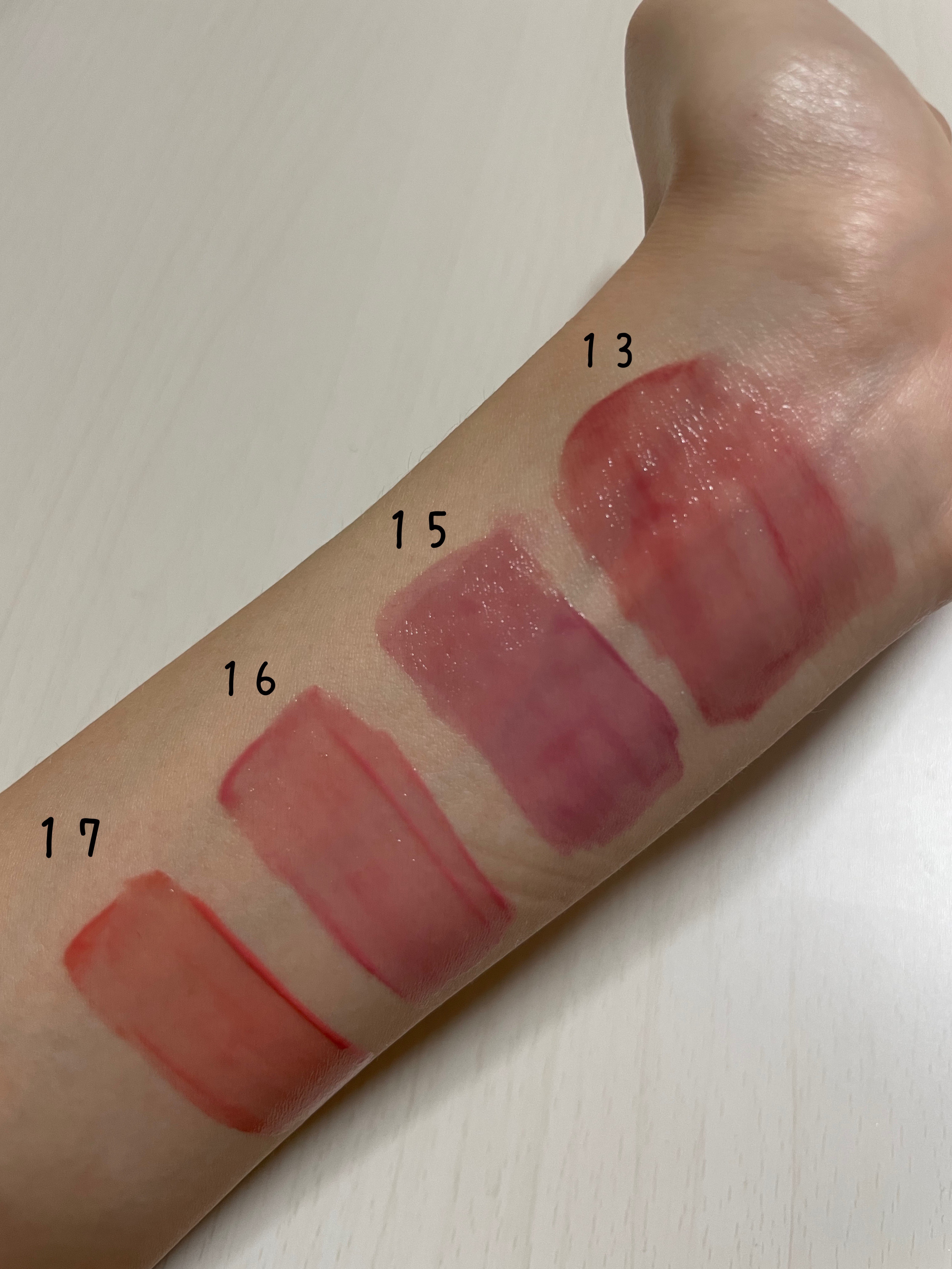 - <01 インコーラル> 水、ビスジグリセリルポリアシルアジペート-2、グリセリン、ジフェニルジメチコン、ジフェニルシロキシフェニルトリメチコン、ポリグリセリン-3、リンゴ酸ジイソステアリル、水添ポリイソブテン、ポリブテン、トリメチルシロキシフェニルジメチコン、変性アルコール、ポリソルベート60、イソノナン酸イソノニル、ペンチレングリコール、(アクリル酸ヒドロキシエチル/アクリロイルジメチルタウリンNa)コポ リマー、ラベンダーエキス、ハナハッカ花/葉/茎エキス、ローズマリーエキス、タイムエキス、ステアリン酸グリセリル、ステアリン酸PEG-100、スクワラン、ラウリルPEG-10トリス(トリメチルシロキシ)シリルエチルジメチコン、エチルヘキシルグリセリン、デキストリン、ステビオシド、イソステアリン酸ソルビタン、エチレンジアミンジコハク酸3Na、水酸化Al、ポリアクリル酸アンモニウム、BG、トコフェロール、フェノキシエタノール、香料、リモネン、酸化チタン、黄5、赤227、黄4、青1 <03 イフローズ> 水、ビスジグリセリルポリアシルアジペート-2、グリセリン、ジフェニルジメチコン、ジフェニルシロキシフェニルトリメチコン、ポリグリセリン-3、リンゴ酸ジイソステアリル、水添ポリイソブテン、ポリブテン、トリメチルシロキシフェニルジメチコン、変性アルコール、ポリソルベート60、イソノナン酸イソノニル、ペンチレングリコール、(アクリル酸ヒドロキシエチル/アクリロイルジメチルタウリンNa)コポリマー、ラベンダーエキス、ハナハッカ花/葉/茎エキス、ローズマリーエキス、タイムエキス、ステアリン酸グリセリル、ステアリン酸PEG-100、スクワラン、ラウリルPEG-10トリス(トリメチルシロキシ)シリルエチルジメチコン、エチルヘキシルグリセリン、デキストリン、ステビオシド、トリイソステアリン酸ポリグリセリル-2、イソステアリン酸ソルビタン、エチレンジアミンジコハク酸3Na、水酸化Al、ポリアクリル酸アンモニウム、BG、トコフェロール、フェノキシエタノール、香料、リモネン、酸化チタン、黄5、赤227、青1、黄4、赤218 <04 チリアップ> 水、ビスジグリセリルポリアシルアジペート-2、グリセリン、ジフェニルジメチコン、ジフェニルシロキシフェニルトリメチコン、ポリグリセリン-3、リンゴ酸ジイソステアリル、水添ポリイソブテン、ポリブテン、トリメチルシロキシフェニルジメチコン、変性アルコール、ポリソルベート60、イソノナン酸イソノニル、ペンチレングリコール、(アクリル酸ヒドロキシエチル/アクリロイルジメチルタウリンNa)コポ リマー、ラベンダーエキス、ハナハッカ花/葉/茎エキス、ローズマリーエキス、タイムエキス、ステアリン酸グリセリル、ステアリン酸PEG-100、スクワラン、ラウリルPEG-10トリス(トリメチルシロキシ)シリルエチルジメチコン、エチルヘキシルグリセリン、デキストリン、ステビオシド、イソステアリン酸ソルビタン、エチレンジアミンジコハク酸3Na、トコフェロール、BG、フェノキシエタノール、料、リモネン、黄5、赤227、黄4、青1 <06 チュリアン> 水、ビスジグリセリルポリアシルアジペート-2、グリセリン、ジフェニルジメチコン、ジフェニルシロキシフェニルトリメチコン、ポリグリセリン-3、リンゴ酸ジイソステアリル、水添ポリイソブテン、ポリブテン、トリメチルシロキシフェニルジメチコン、変性アルコール、ポリソルベート60、イソノナン酸イソノニル、ペンチレングリコール、(アクリル酸ヒドロキシエチル/アクリロイルジメチルタウリンNa)コポリマー、ラベンダーエキス、ハナハッカ花/葉/茎エキス、ローズマリーエキス、タイムエキス、ステアリン酸グリセリル、ステアリン酸PEG-100、スクワラン、ラウリルPEG-10トリス(トリメチルシロキシ)シリルエチルジメチコン、エチルヘキシルグリセリン、デキストリン、ステビオシド、イソステアリン酸ソルビタン、エチレンジアミンジコハク酸3Na、水酸化Al、ポリアクリル酸アンモニウム、BG、トコフェロール、フェノキシエタノール、香料、リモネン、酸化チタン、黄5、赤227、酸化鉄、黄4、赤218、青1 <08 ベリーディヴァイン> 水、ビスジグリセリルポリアシルアジペート-2、グリセリン、ジフェニルジメチコン、ジフェニルシロキシフェニルトリメチコン、ポリグリセリン-3、リンゴ酸ジイソステアリル、水添ポリイソブテン、ポリブテン、トリメチルシロキシフェニルジメチコン、変性アルコール、ポリソルベート60、イソノナン酸イソノニル、ペンチレングリコール、(アクリル酸ヒドロキシエチル/アクリロイルジメチルタウリンNa)コポリマー、ラベンダーエキス、ハナハッカ花/葉/茎エキス、ローズマリーエキス、タイムエキス、ステアリン酸グリセリル、ステアリン酸PEG-100、スクワラン、ラウリルPEG-10トリス(トリメチルシロキシ)シリルエチルジメチコン、エチルヘキシルグリセリン、イソステアリン酸ソルビタン、デキストリン、ステビオシド、エチレンジアミン