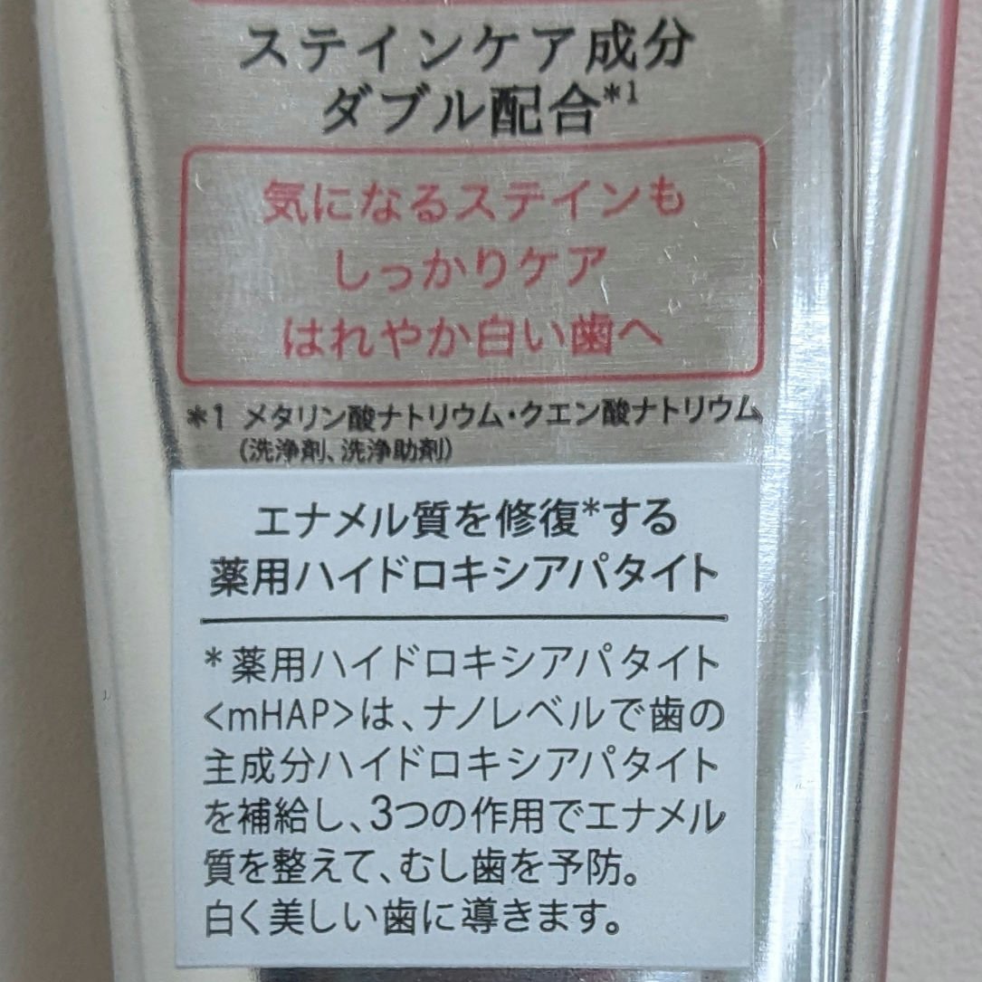 毎日の歯みがきでステインを落とす2つの成分(洗浄剤:メタリン酸ナトリウム、洗浄助剤:クエン酸ナトリウム)を配合。 さらにステインケア成分をW配合*し、コーヒーや紅茶・ワインなどの気になる着色汚れをやさしく落とします。 ふわっと華やぐ香りのジャスミンミントフレーバーが口の中に漂い、使用後、スッキリします♪