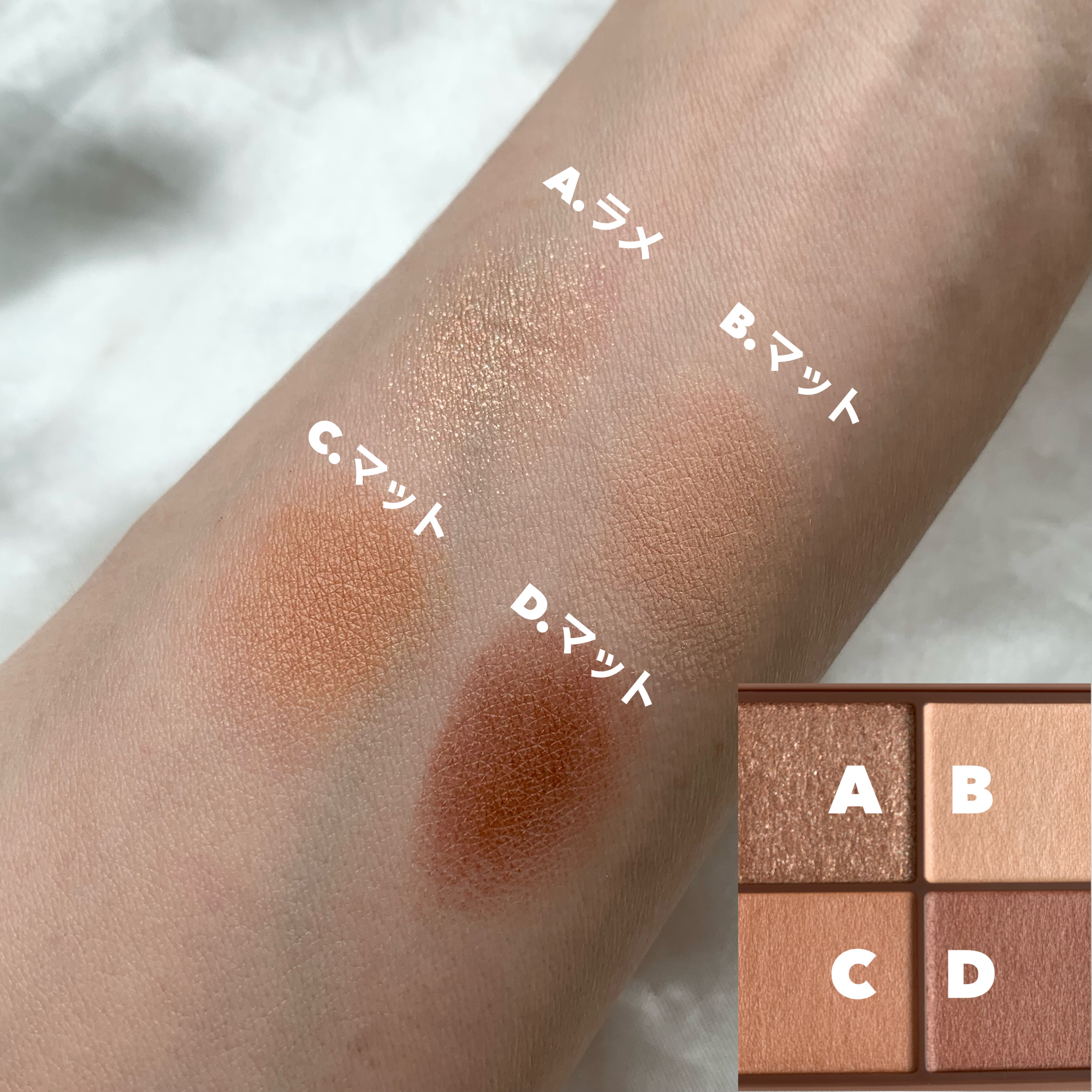 - 透け感マット×濃厚ブラウンの4色アイシャドウ。 しっかり目元を引き締めるビターなブラウンカラー。 透け感のあるブラウンを重ねて、自然な陰影のある目元へ。 ふんわり柔らかなパウダーなので、スルスル伸びてまぶたにピタッと密着。 保湿成分(スクワラン、ホホバ種子油)配合。