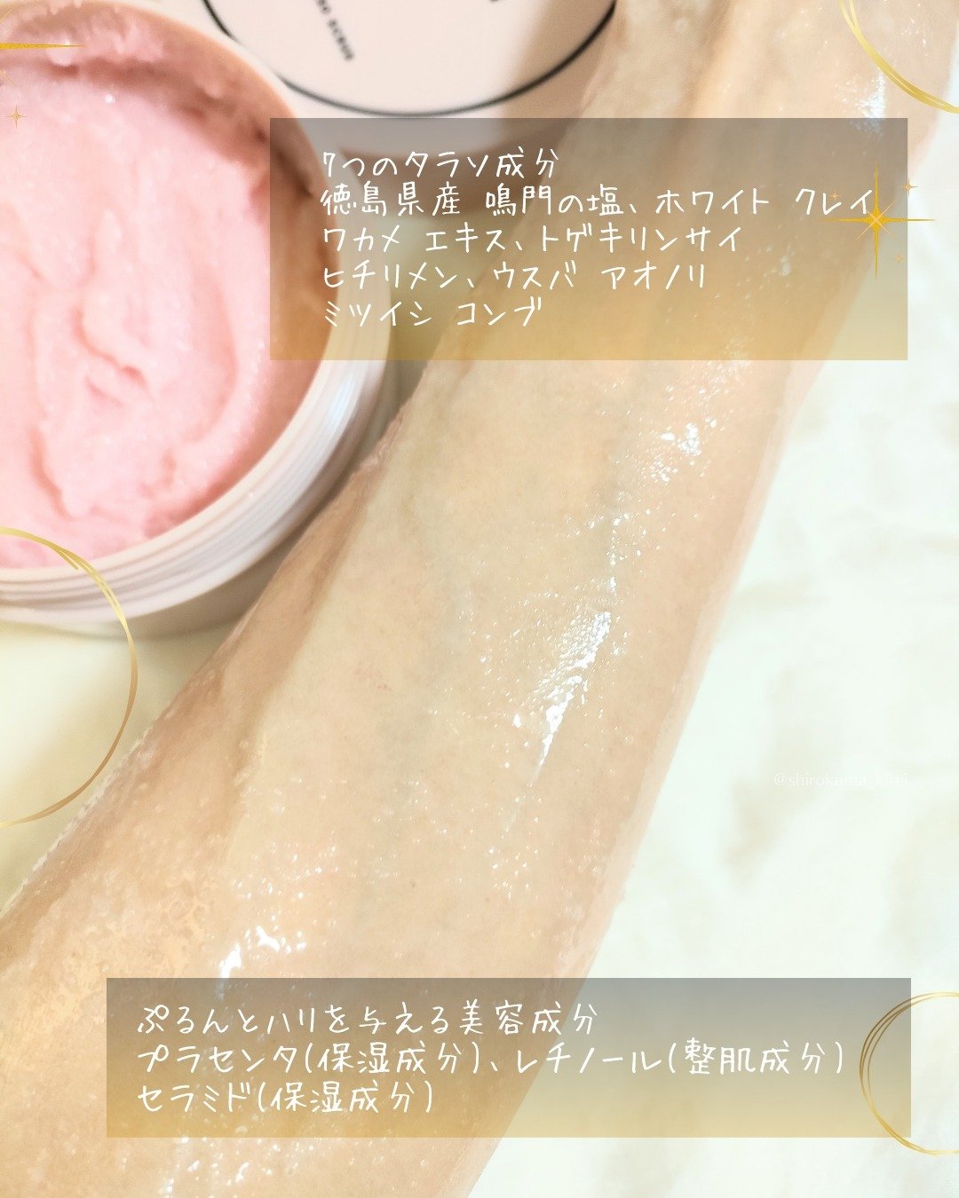- 美容をもっとカジュアルに“AGARISM”とカワイイの欲望を知り尽くした雑誌sweetとのコラボ商品!女性のボディを魅力的にする重要なパーツ「お尻」。古い角質による黒ずみやザラツキ・乾燥ニキビ*などをケア。角質が気になるところにはスクラブとして、気になるデリケートゾーンは泡立てて全身ボディソープとしてOK。バスソルトとしても使える3WAYボディスクラブです。香りもやみつきになるフェロモンな香りにうっとりします! *洗浄によりニキビを防ぐ