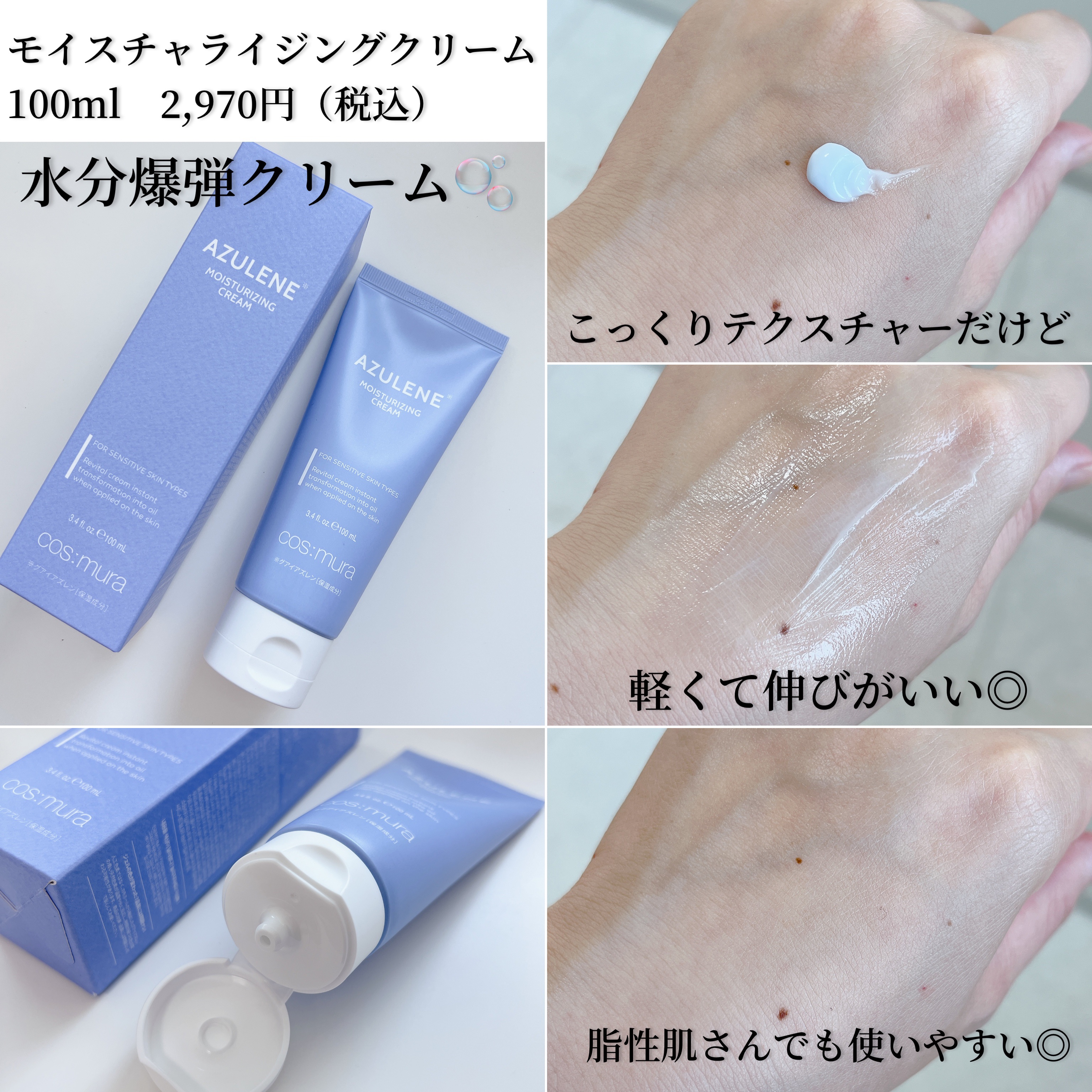 ポンプタイプで出す化粧水🧴 なんとこの化粧水250mlと大容量! なので惜しむことなくパシャパシャ使える😆 乾燥肌、脂性肌どちらにも使えるクリーム! こちらも100mlという大容量サイズ🧴 少し青みがある商品なのですが人工色素ではなくアズレン成分の青み🫧 安心して使うことができました✨