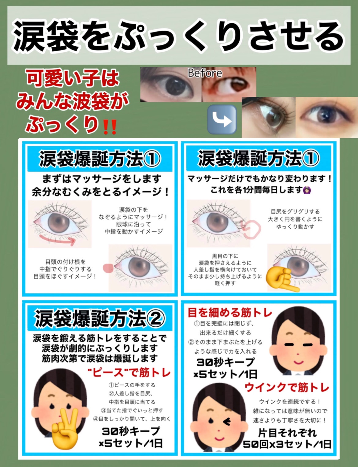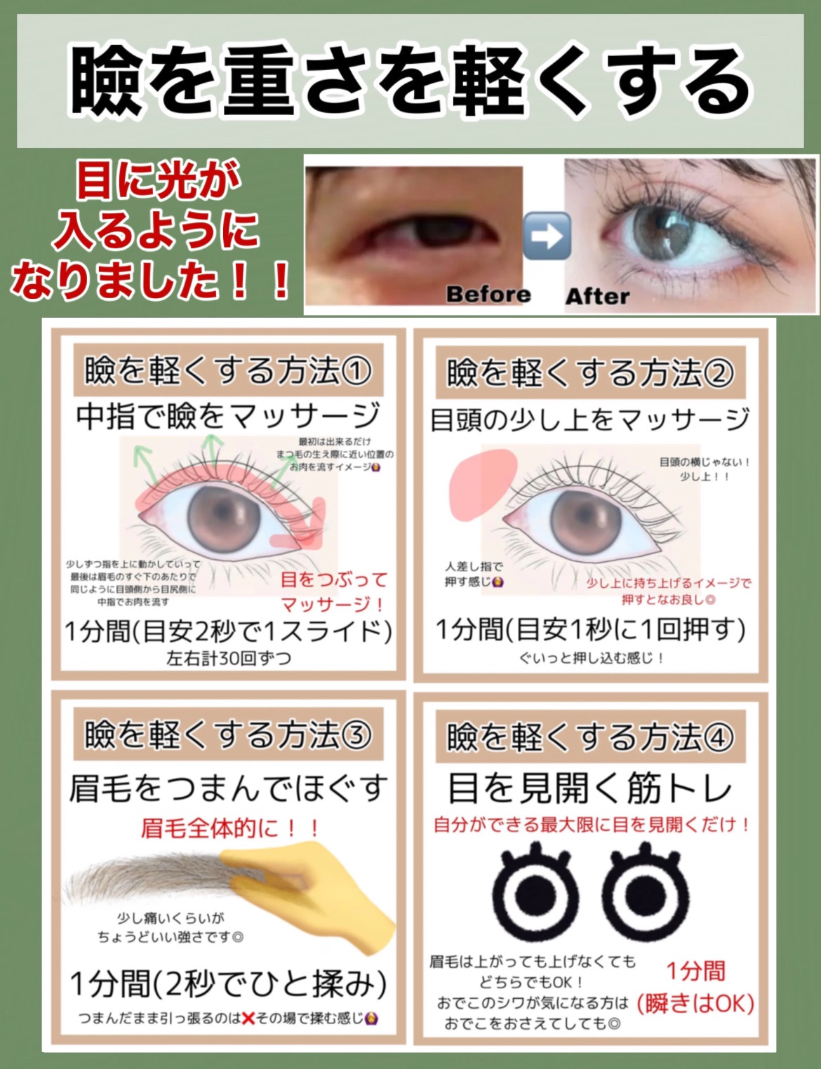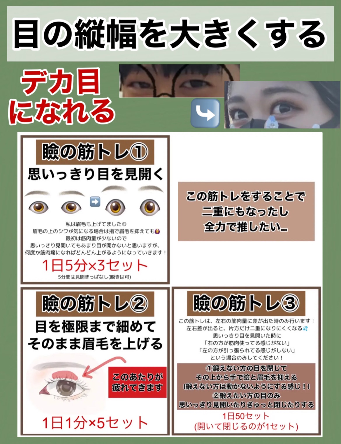 【瞼の筋トレ】について詳しく解説!!これさえすれば絶対変われます!!!瞼の筋トレって?という方は、画像をご覧下さい‼️これがないと私は今頃二重になってなかった…と言っても過言ではないくらい、私の癖付けには欠かせなかったものです!!今回は、昔からしている筋トレ1つと、最近思いついて実践している筋トレ2つをご紹介します!!どれもすごく簡単なので、ぜひ試してみてください📷Q 一日どのくらいしてた?A とにかく暇さえあればしていました!!1日30分の日もあれば、何時間もする日もありましたこの筋トレは、お風呂に入りながらや勉強しながら、スマホ見ながらでもできるのがいいところなので、スキマ時間を上手く活用するのがいいかな思います💭Q 今まで何回くらい筋肉痛になった?A 左右どちらも5回くらいだと思います!瞼が私より軽い方は、1、2回で十分スッキリすると思いますよ❣️Q どれくらいで筋肉痛になった?A 筋肉痛までは平均して2週間くらいかかりました!でもフォロワーさんの中には1日でなられた方も多くいらっしゃいますなのでその人の瞼や頑張り次第だと思います❣️Q 筋トレ1