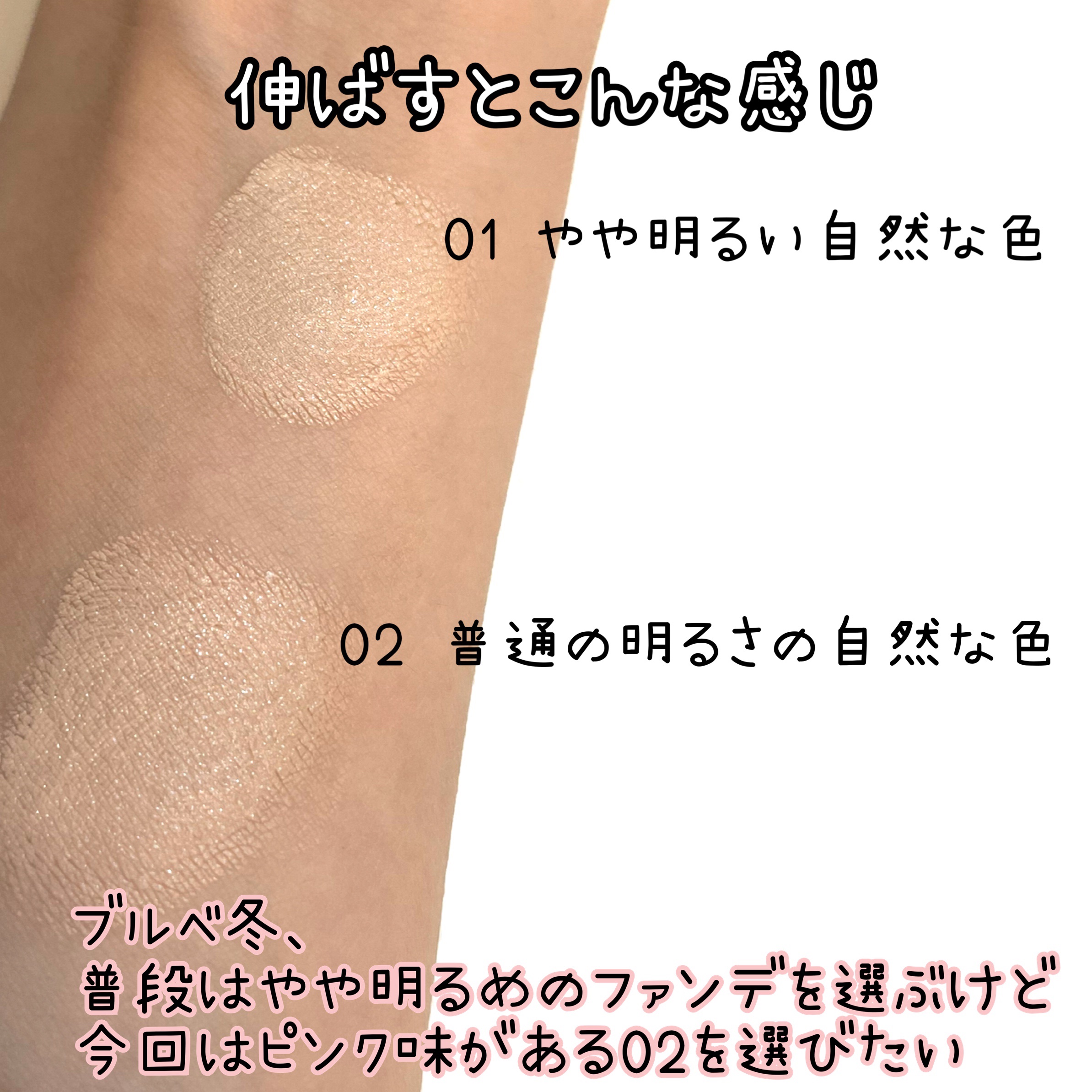 - <01 やや明るい自然な色> 水、シクロペンタシロキサン、メトキシケイヒ酸エチルヘキシル、イソノナン酸イソトリデシル、エタノール、PEG-9ポリジメチルシロキシエチルジメチコン、メチルトリメチコン、ジエチルアミノヒドロキシベンゾイル安息香酸ヘキシル、パルミチン酸オクチル、メチレンビスベンゾトリアゾリルテトラメチルブチルフェノール、ジステアルジモニウムヘクトライト、ビスエチルヘキシルオキシフェノールメトキシフェニルトリアジン、アカヤジオウ根エキス、クインスシードエキス、ゲットウ葉エキス、シロキクラゲエキス、トウキ根エキス、トコフェロール、ノイバラ果実エキス、ハトムギ種子エキス、ベニバナ花エキス、ボタンエキス、メドウフォーム油、メロスリア根エキス、加水分解イネ葉エキス、BG、BHT、(アクリレーツ/アクリル酸エチルヘキシル/メタクリル酸ジメチコン)コポリマー、アルミナ、シリカ、ジメチコン、ステアラルコニウムヘクトライト、ステアロイルグルタミン酸2Na、タルク、ダイマージリノール酸(フィトステリル/イソステアリル/セチル/ステアリル/ベヘニル)、デシルテトラデカノール、トリエトキシカプリリルシラン、ポリイソプレン、ポリメチルシルセスキオキサン、メタクリル酸メチルクロスポリマー、ラウリルPEG-9ポリジメチルシロキシエチルジメチコン、ラウリン酸ポリグリセリル-10、塩化Na、合成フルオロフロゴパイト、酸化スズ、水酸化Al、乳酸セチル、フェノキシエタノール、香料、酸化チタン、酸化亜鉛、酸化鉄 <02 普通の明るさの自然な色> 水、シクロペンタシロキサン、メトキシケイヒ酸エチルヘキシル、イソノナン酸イソトリデシル、エタノール、PEG-9ポリジメチルシロキシエチルジメチコン、メチルトリメチコン、ジエチルアミノヒドロキシベンゾイル安息香酸ヘキシル、パルミチン酸オクチル、メチレンビスベンゾトリアゾリルテトラメチルブチルフェノール、ジステアルジモニウムヘクトライト、ビスエチルヘキシルオキシフェノールメトキシフェニルトリアジン、アカヤジオウ根エキス、クインスシードエキス、ゲットウ葉エキス、シロキクラゲエキス、トウキ根エキス、トコフェロール、ノイバラ果実エキス、ハトムギ種子エキス、ベニバナ花エキス、ボタンエキス、メドウフォーム油、メロスリア根エキス、加水分解イネ葉エキス、BG、BHT、(アクリレーツ/アクリル酸エチルヘキシル/メタクリル酸ジメチコン)コポリマー、アルミナ、シリカ、ジメチコン、ステアラルコニウムヘクトライト、ステアロイルグルタミン酸2Na、タルク、ダイマージリノール酸(フィトステリル/イソステアリル/セチル/ステアリル/ベヘニル)、デシルテトラデカノール、トリエトキシカプリリルシラン、ポリイソプレン、ポリメチルシルセスキオキサン、メタクリル酸メチルクロスポリマー、ラウリルPEG-9ポリジメチルシロキシエチルジメチコン、ラウリン酸ポリグリセリル-10、塩化Na、合成フルオロフロゴパイト、酸化スズ、水酸化Al、乳酸セチル、フェノキシエタノール、香料、酸化チタン、酸化亜鉛、酸化鉄