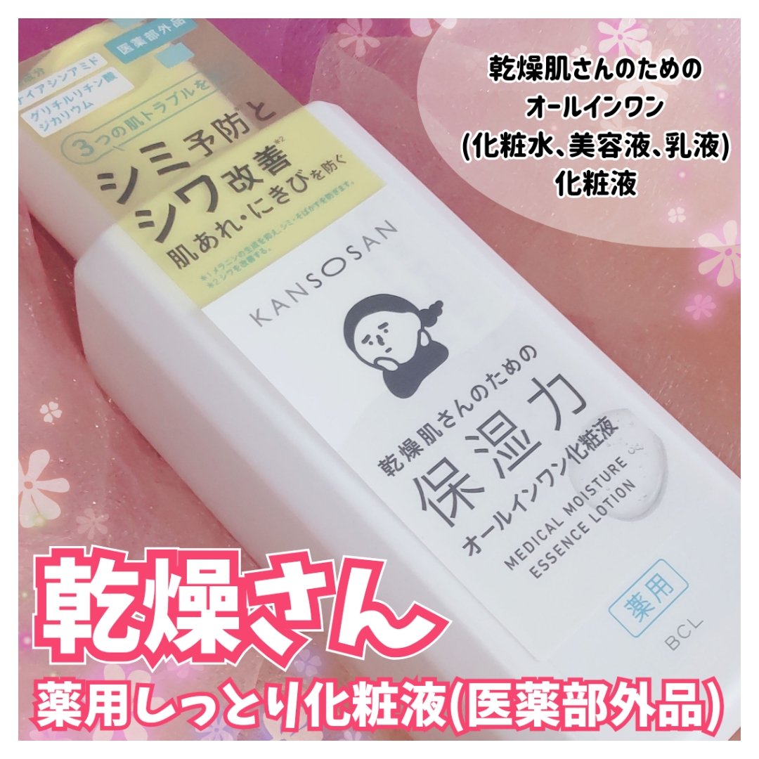 こちらの“乾燥さんメディカルシリーズ”は ♢シミ予防 ♢シワ改善 ♢肌あれ.にきびを防ぐという3つの肌トラブルに着目したスキンケアです 有効成分であるナイアシンアミドとグリチルリチル酸ジカリウムがメラニンの生成を抑制しシミやソバカスを防いだり、シワの改善やニキビを防ぎます なんと1本で「化粧水」「美容液」「乳液」のオールインワン!とろんとしたテクスチャーでホンッとにしっとりで手のひらが肌に吸い付く感じです