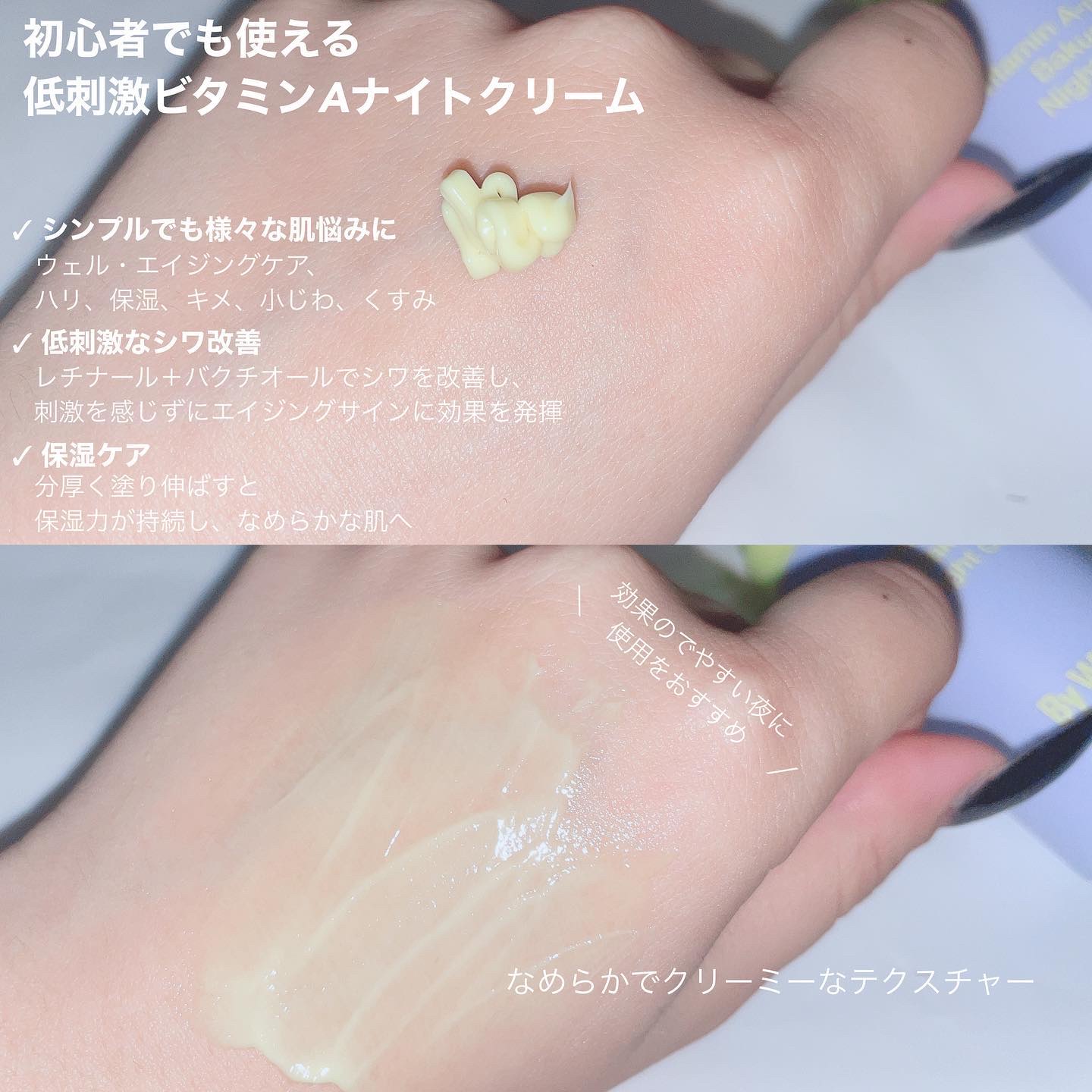 こちらはビタミンAの1種であるバクチオールとレチナールが入っているナイトクリーム💜 植物性レチノールであるバクチオールと、レチノールよりも活性物質への変換が早いというレチナールを組み合わせることで、お肌への優しさも考えられた素晴らしいクリーム👏 テクスチャは伸びよく柔らかいクリーム🍦 私は刺激感なく、赤みとかもでずに使えました💖