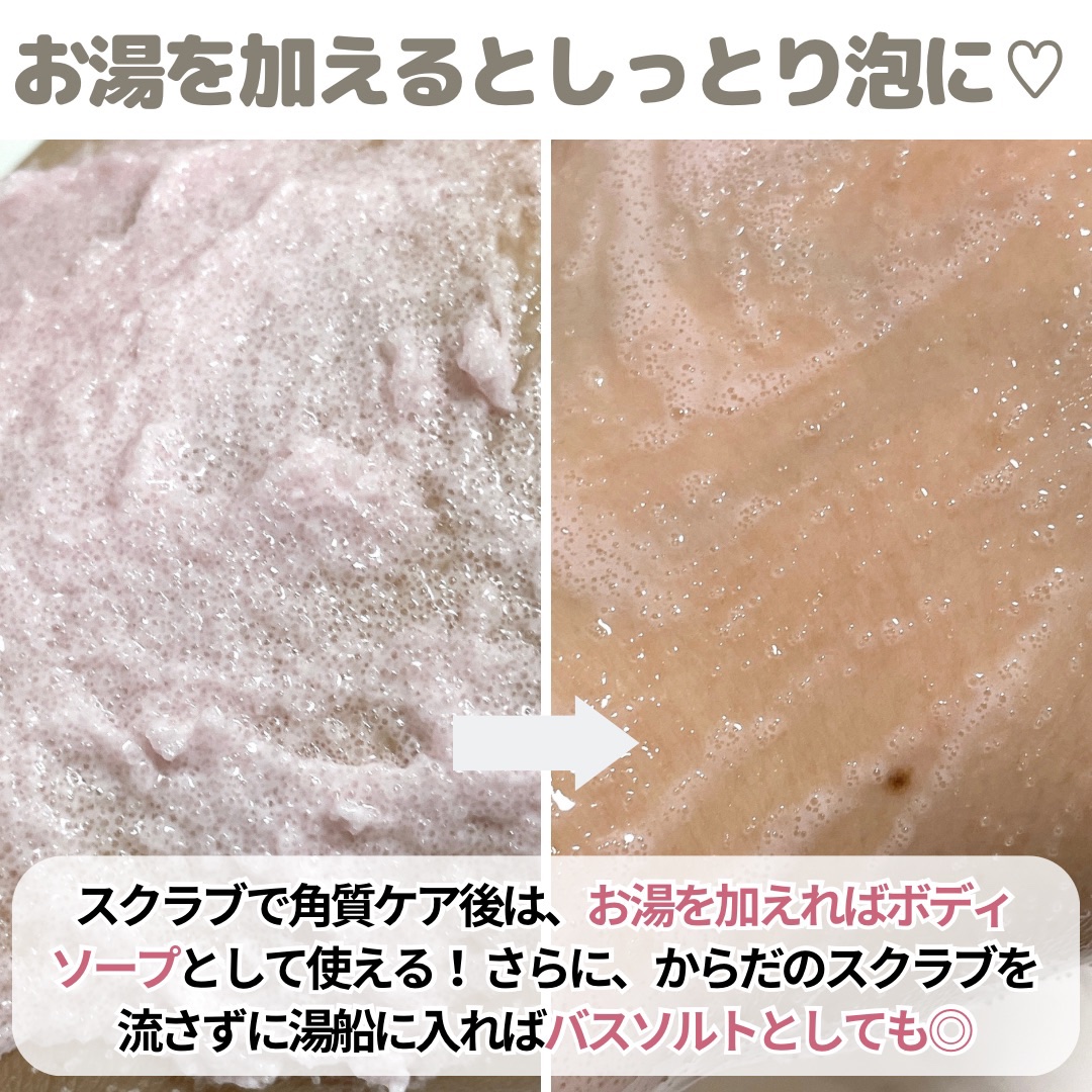 AGARISM Q+Me スイートボムタラソスクラブこれ1つで「スクラブ」「ボディソープ」「バスソルト」の3役をこなせる万能アイテム時短でボディケアができるので、疲れた日や忙しいときに大活躍してくれますテクスチャーは硬めで、肌にのせるとスクラ...
