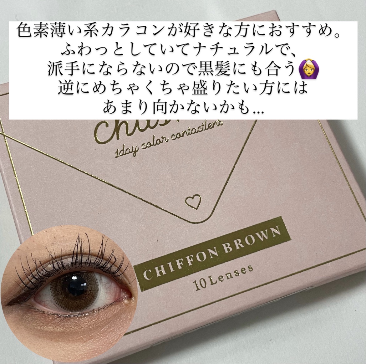 こちらは今回紹介する中で一番発色の良いブラウンという印象でした!モラクは着色直径は全て小さいので本当にナチュラルに盛れます! こちらは個人的にめちゃくちゃ推しのカラコンです!今回紹介するカラコンの中では一番着色直径が大きいですが、体感はもう少し小さめに感じました!ナチュラルに盛れます🫶 こちらは色素薄い系になれるカラコンです!エバーカラーより着色直径は小さいですが、個人的にはこちらの方が大きく感じました。黒髪にも合う色素薄い系だと思います! こちらもかなりナチュラルです!着色直径13.4ですが、体感もう少し小さく感じました!ナチュラルなメイクにも黒髪にも合う色で、シーンを選ばず使えると思います!トパーズは他にもいくつか使いましたが、全てナチュラルで使いやすいと思います!